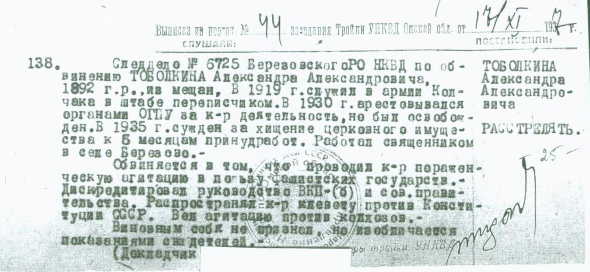 Последним официально служащим священником на территории Югры в советское время был иерей Березовской церкви Александр Тоболкин (1892–1937). Когда он, будучи юношей, заявил о своем желании стать батюшкой, его отец тут же ответил: "Готовься сидеть в тюрьме". Так в будущем и случилось. Сказанные односельчанам слова о том, что "все земное здесь истлеет, уничтожится", послужили основанием к аресту не только отца Александра, но и нескольких его знакомых верующих.