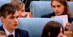 Отвечая на вопросы авторов доклада, один из школьников рассказал, что его обвинили в "неуважении к государству", когда он уронил в школе книгу о Республике Беларусь.