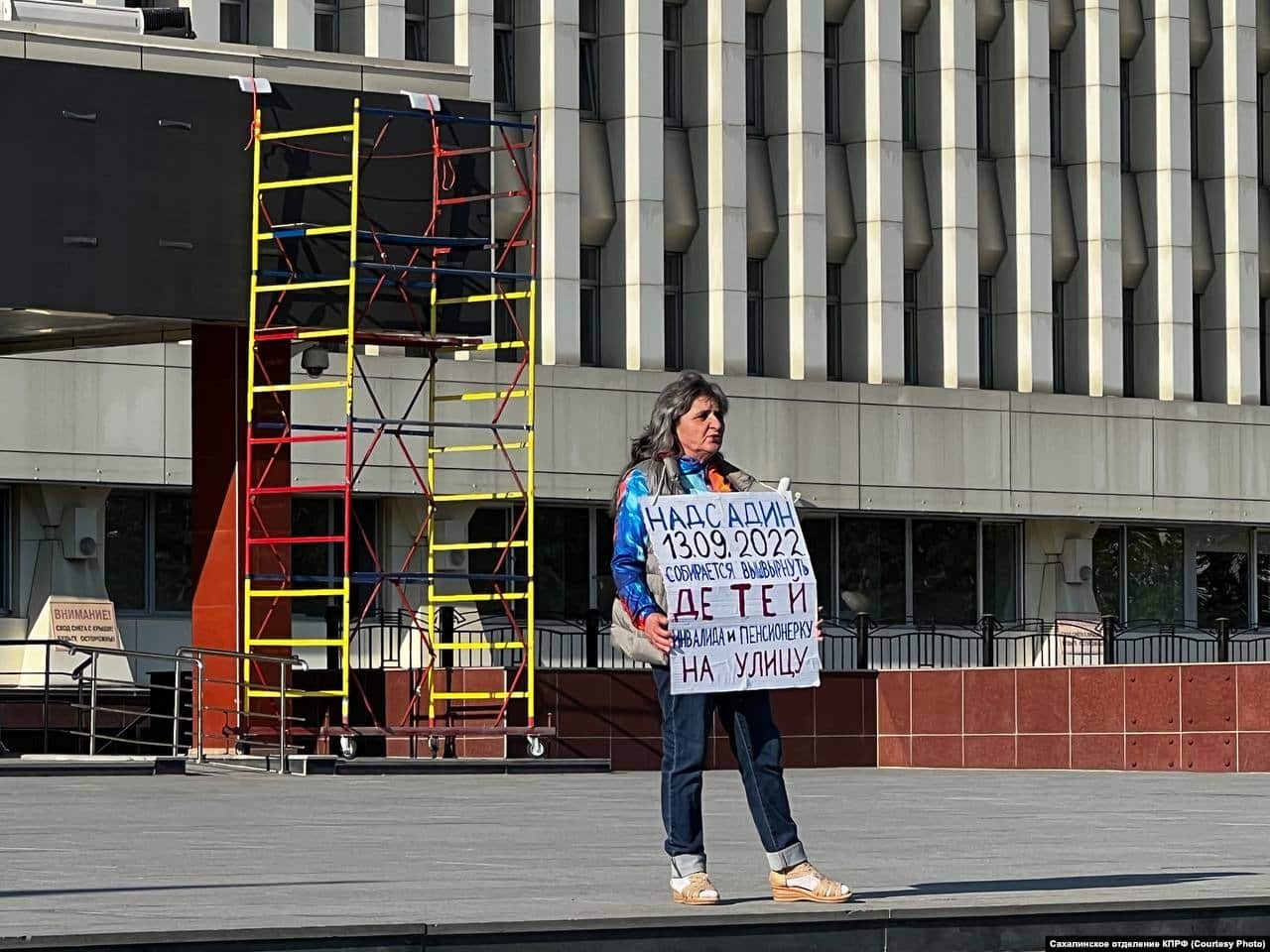 Пенсионерка из Южно-Сахалинска Альбина Зотова проводит пикеты против мэра Сергея Надсадина у здания областной администрации. Она выступает против выселения из дома под снос, сообщил "Сахком".