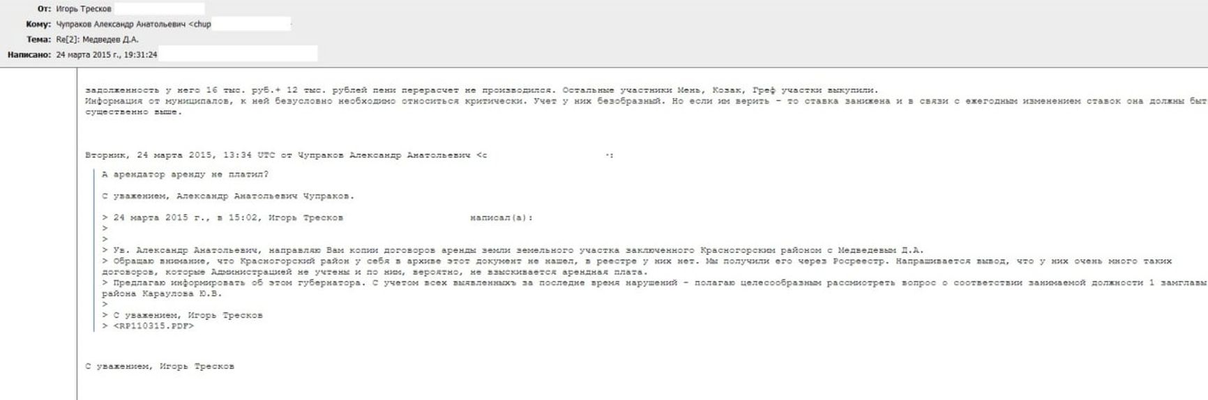 12 сентября 2022Бывший президент, а ныне зампред Совета безопасности Дмитрий Медведев с 2002 года арендовал элитный участок в поселке «Архангельское» Красногорского района рыночной стоимостью около полумиллиарда рублей за полторы тысячи рублей, следует из документов взломанной переписки вице-губернатора Московской области Игоря Трескова. Документы были опубликованы Telegram-каналом Black Mirror. Интересно, что даже эту копеечную сумму Медведев не заплатил. Из переписки следует, что соседние участки достались Михаилу Меню, Дмитрию Козаку и Герману Грефу. Участок достался Медведеву на фоне закрытия уголовного дела против главы Красногорского района.