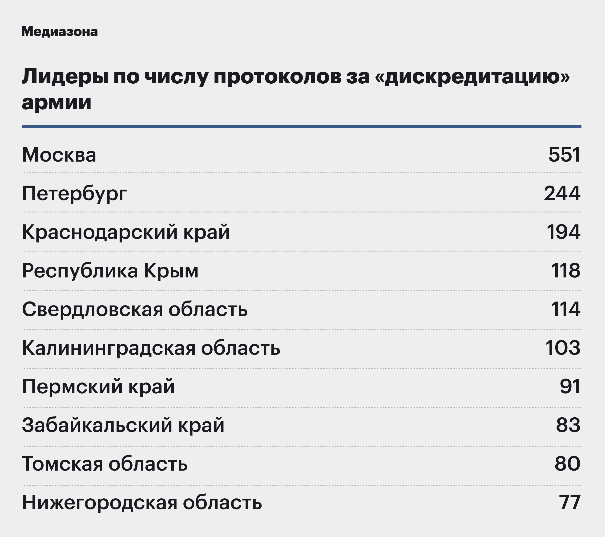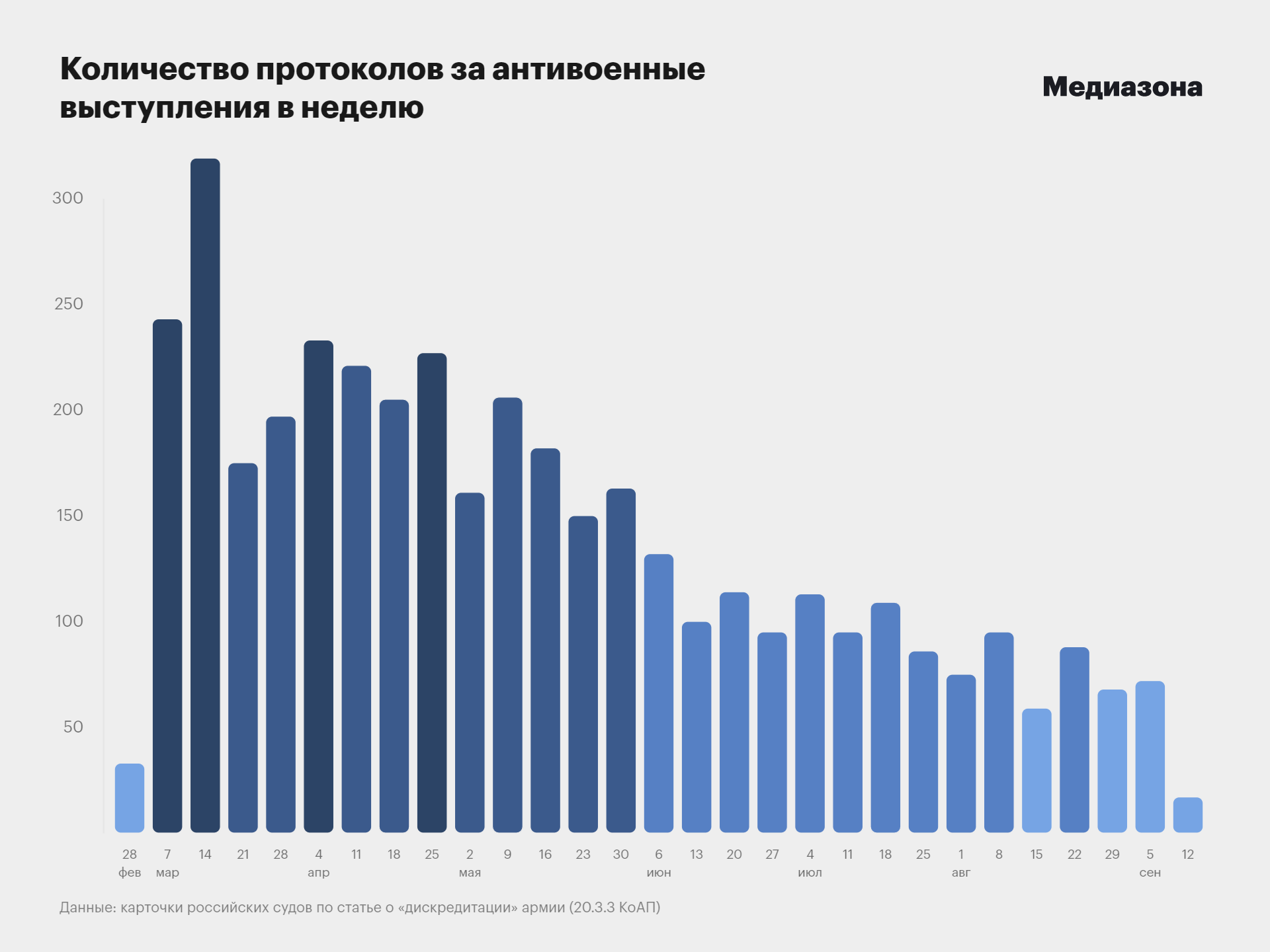 С начала марта 2022 года в российские суды поступило 4 035 административных дел о «дискредитации» российской армии, следует из данных системы ГАС «Правосудие», собранных «Медиазоной».