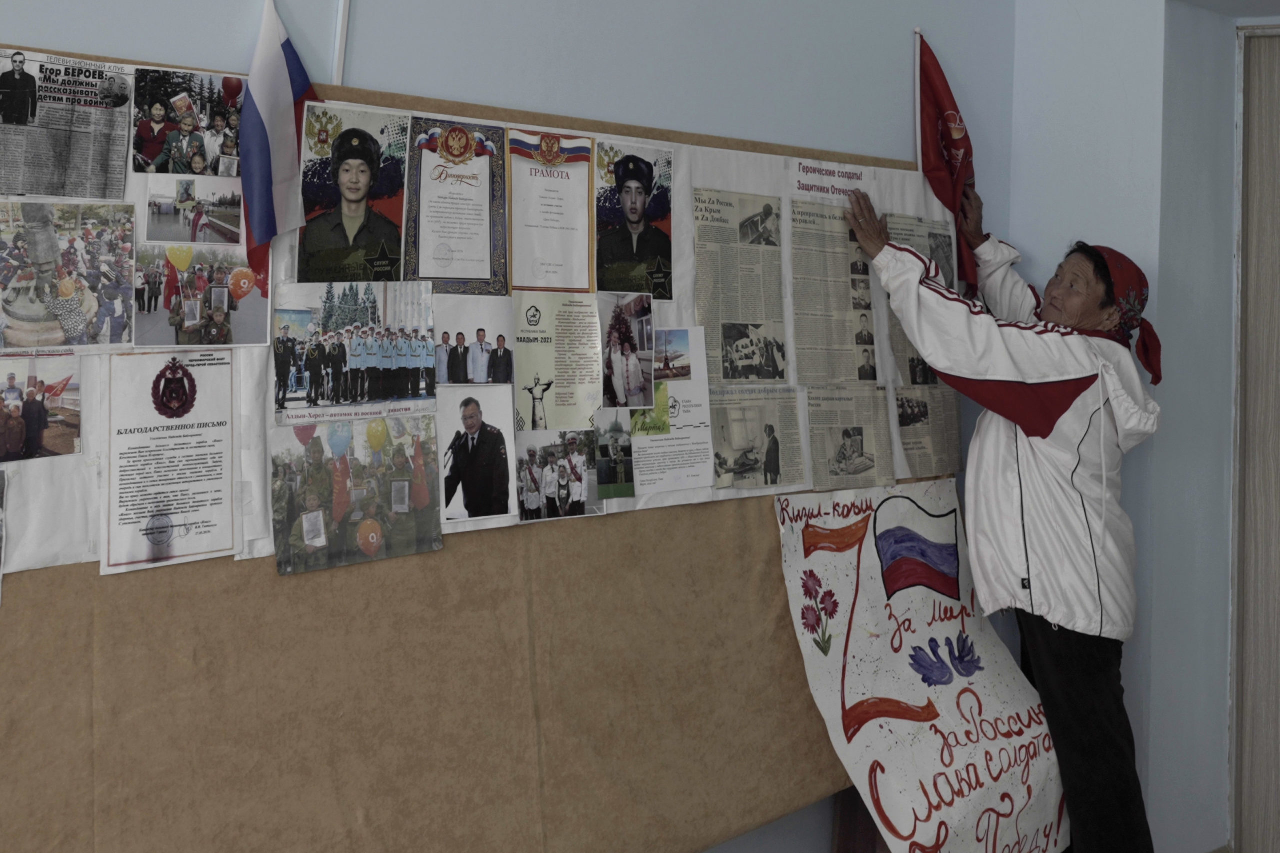 Возле двери — стенд с бережно вырезанными из газет некрологами и фотографиями жителей Тувы, погибших в Украине: