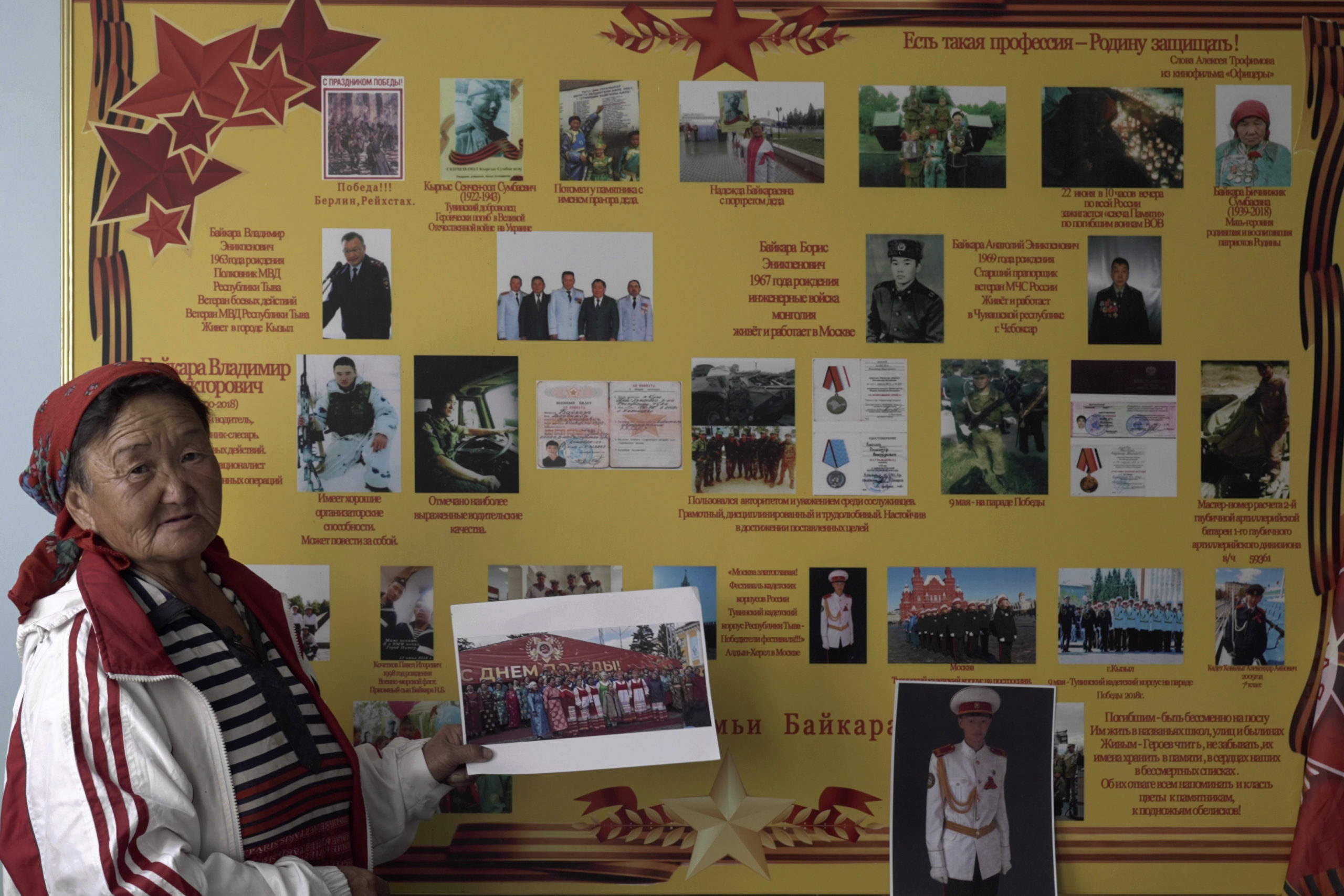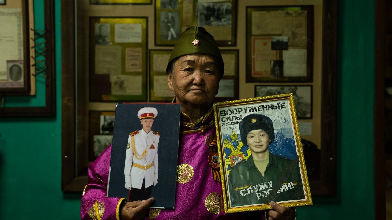 К халату Надежды у сердца приколота георгиевская лента. На голове — советская пилотка со звездой. Такая же, как на старой фотографии ее дяди, судебного секретаря Кыргыса Сенчин-оола. Тот в 1943-м, за год до присоединения Тувы к России, добровольцем ушел на фронт, героически погиб в 1944-м и похоронен в братской могиле в Ровенской области Украины. 70 лет спустя в Украине оказался единственный родной сын Надежды, Владимир. А через восемь лет, в 2022-м, — и внук Алдын-Херел.