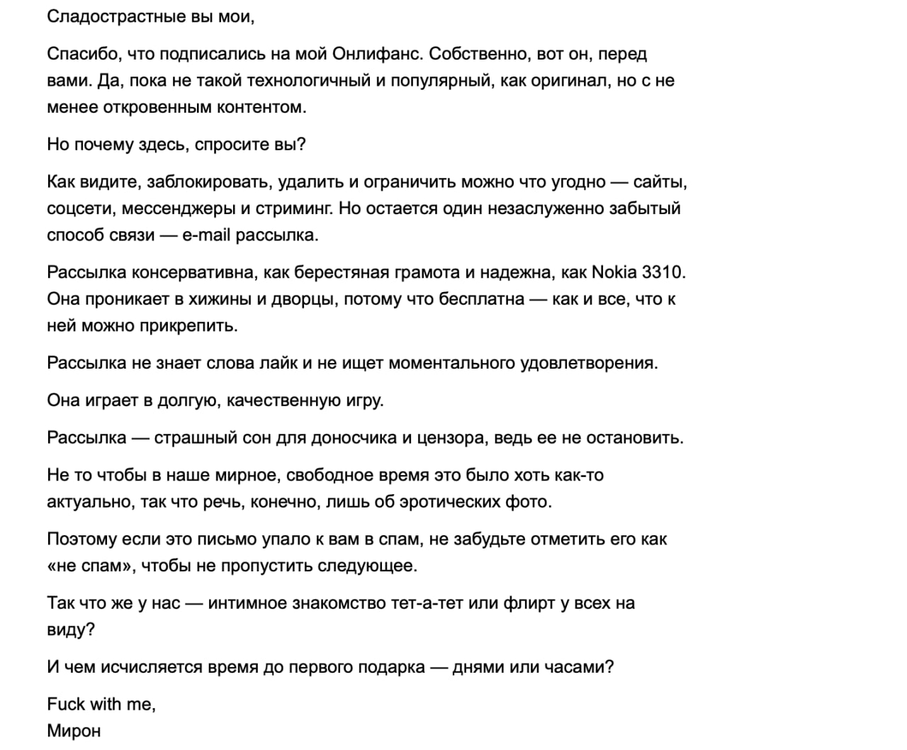 «Как видите, заблокировать, удалить и ограничить можно что угодно — сайты, соцсети, мессенджеры и стриминг. Но остается один незаслуженно забытый способ связи — e-mail рассылка. Рассылка консервативна, как берестяная грамота и надежна, как Nokia 3310. Она проникает в хижины и дворцы, потому что бесплатна — как и все, что к ней можно прикрепить», — указано в первом письме Оксимирона.
