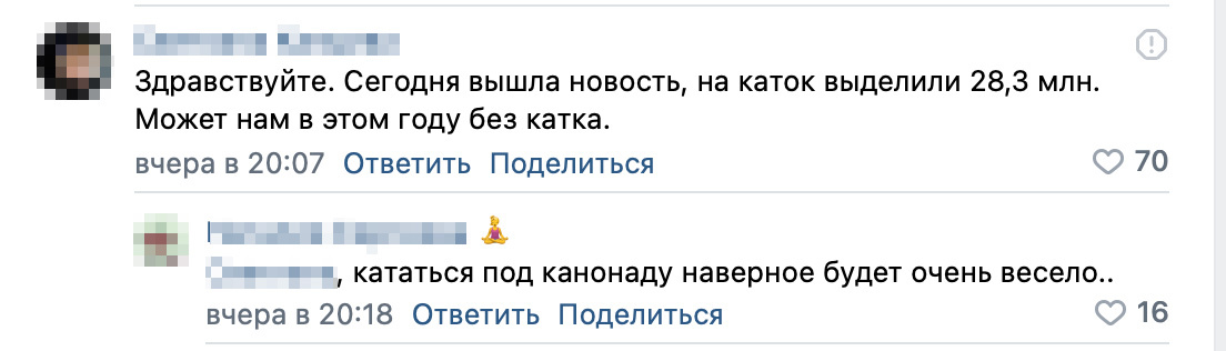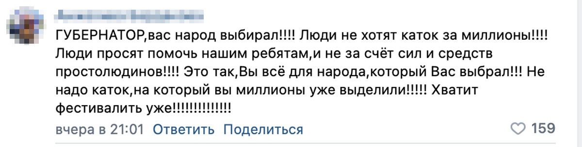 Белгородские журналисты 14 сентября выяснили, что власти собираются залить крытый каток стоимостью более 28 миллионов рублей. Тендер должен пройти 23 сентября, однако местные жители недовольные растратой средств запустили петицию с призывом отказаться от постройки катка, отменить все праздники и отправить деньги российской армии. Почти 2500 тысячи человек подписали петицию, многие из жителей также пошли в комментарии под посты губернатора области, Вячеслава Гладкова. Сейчас количество сообщений около сотни.