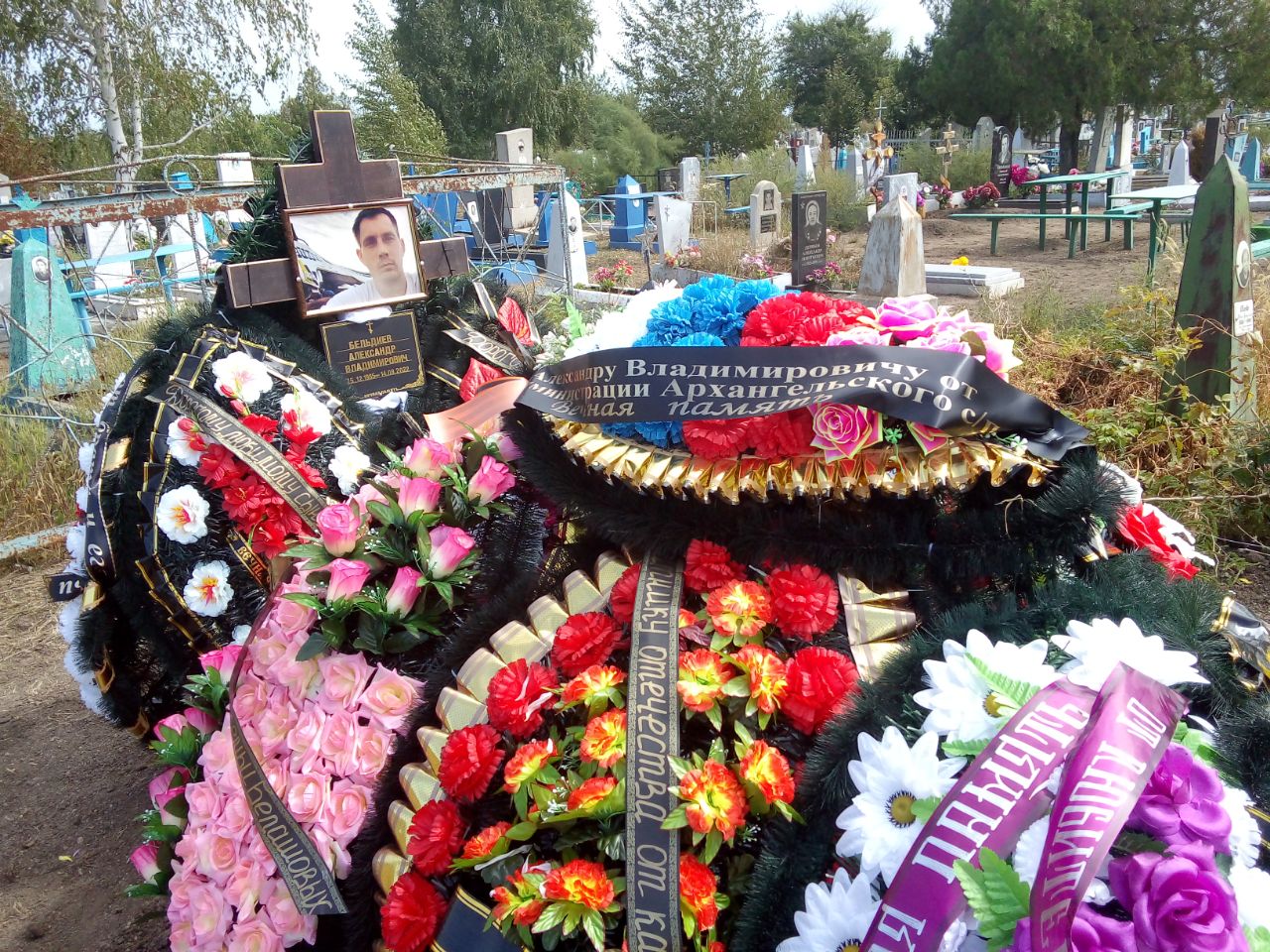- Александр Владимирович Бельдиев (1985 – 14 августа 2022). Фото в гражданской одежде и венки "Защитнику отечества" от администрации сельского поселения.