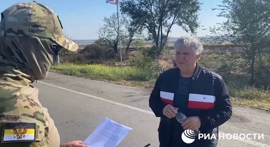 16:43 РИА Новости показало видео из Запорожской области о «выдворении на Украину неблагонадежных граждан с освобожденных территорий за ведение подрывной деятельности». На нем какую-то бумагу зачитывает человек с российским флагом на кепке и с черно-желто-белым шевроном с имперским орлом на рукаве.