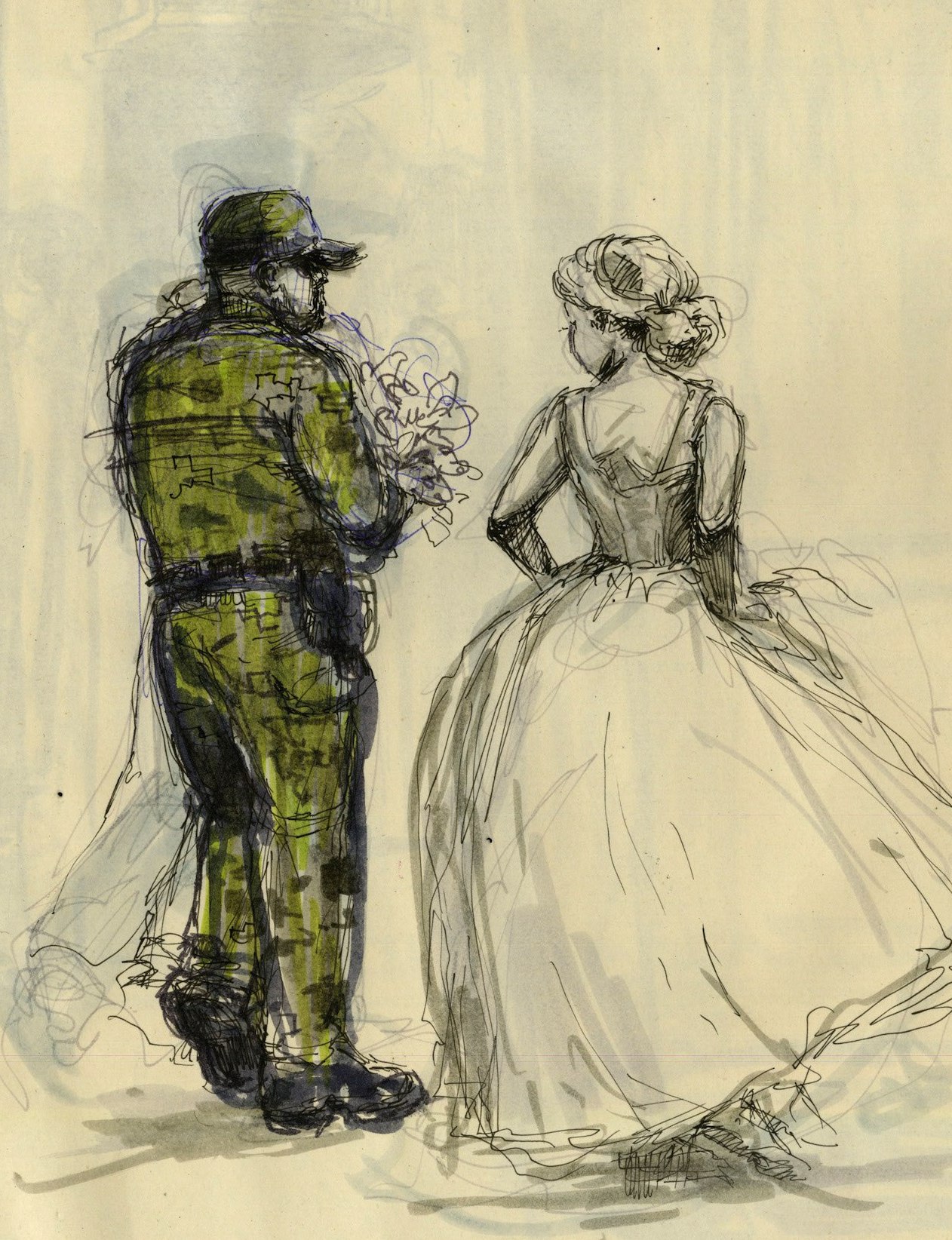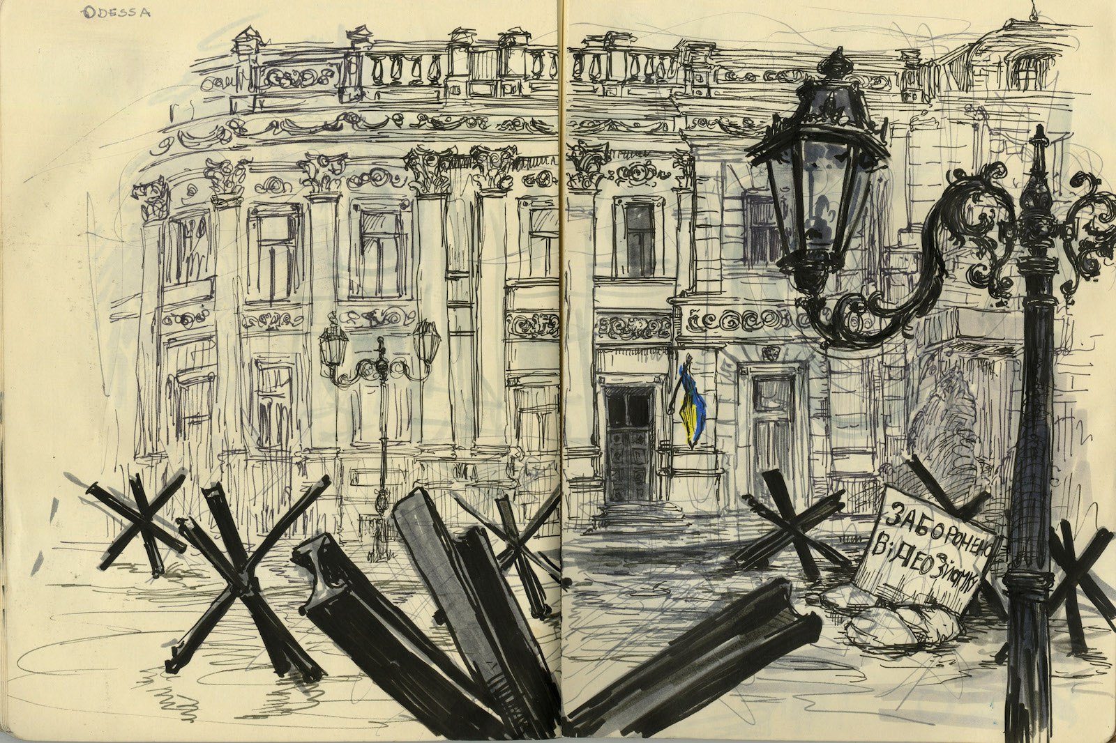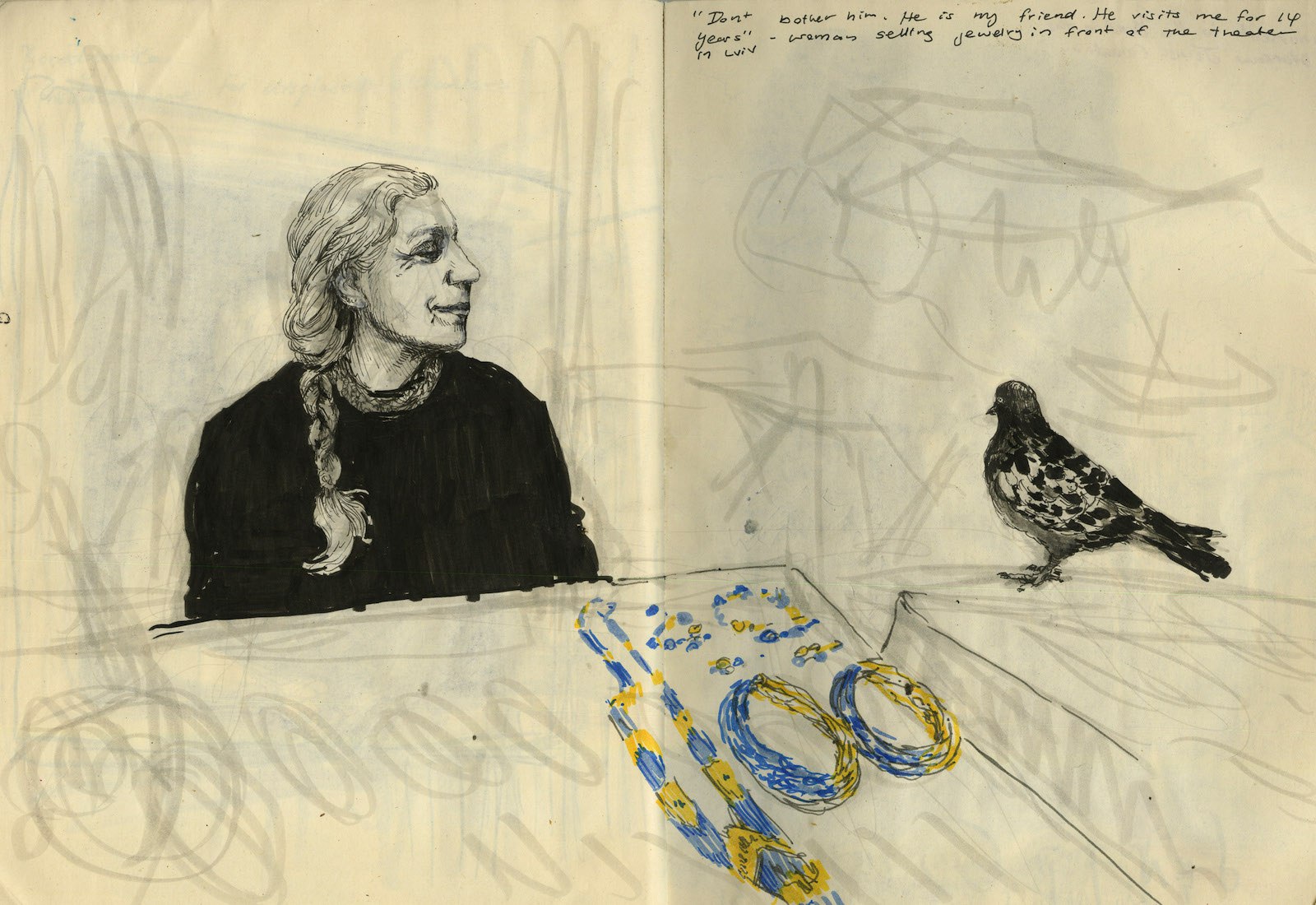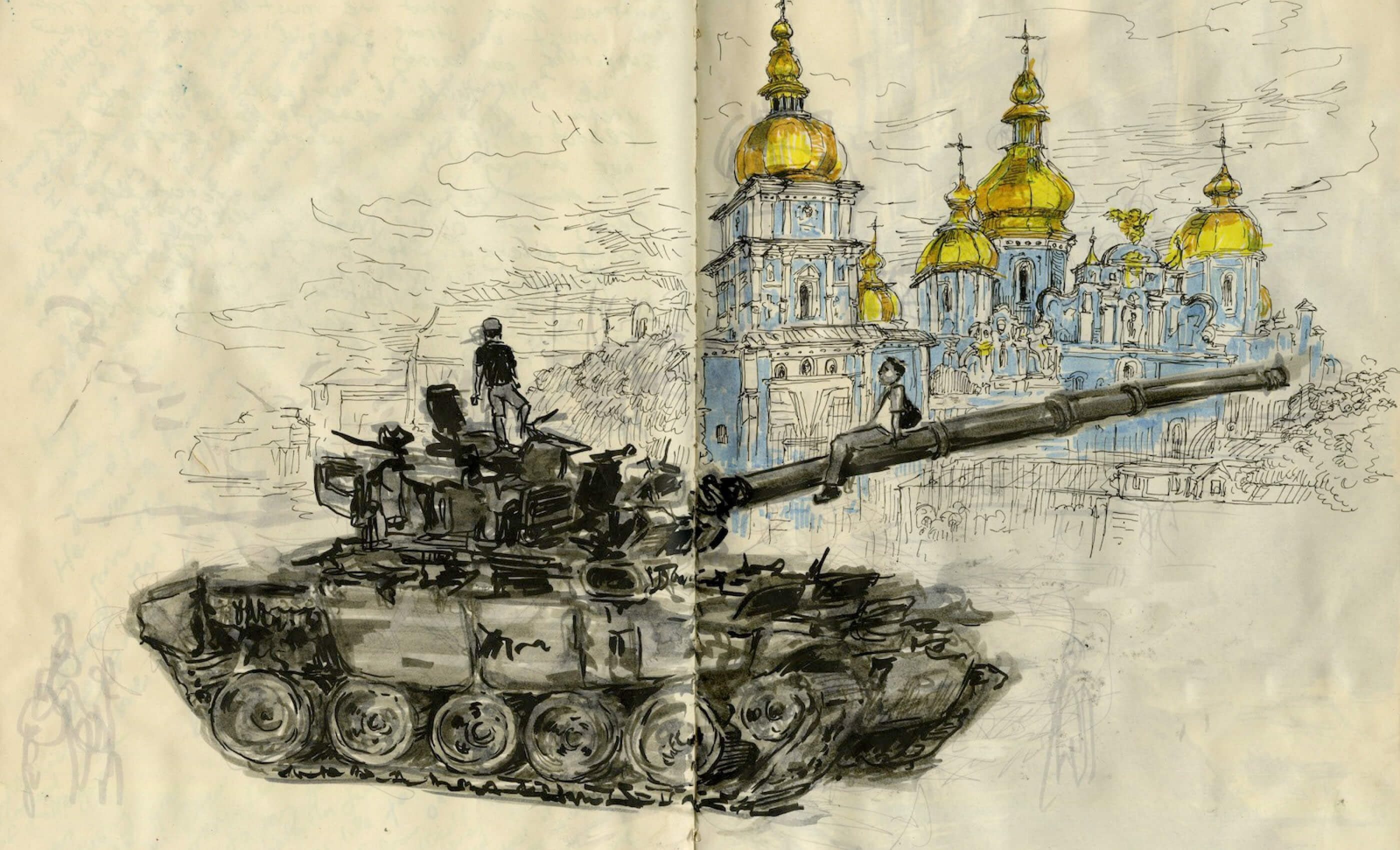В августе я две недели ездила по Украине на поездах и зарисовывала в блокноте повседневную жизнь в тени российского вторжения. К началу моего путешествия украинская армия оттеснила войну обратно к югу и востоку страны. Львов, Одесса и Киев вернулись к бурной жизни. Дети рассекали на самокатах. Уличные музыканты играли на бандурах. Бабушки продавали овощи с лотков. Девушки с идеальными укладками курили кальяны в кафе, которые выплеснулись из помещений на мощенные булыжником улицы. Но все это волшебство обманчиво. Какой масштаб ни возьми, крупный или мелкий, война искалечила жизнь каждого.