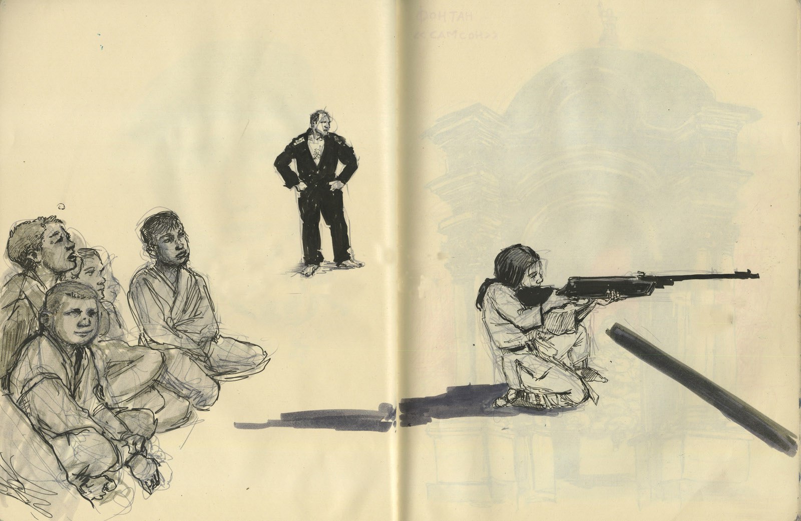 Девочка с винтовкой в додзе. Буча, 5 августа. Иллюстрация: Молли Крэбэппл / New York Review of Books