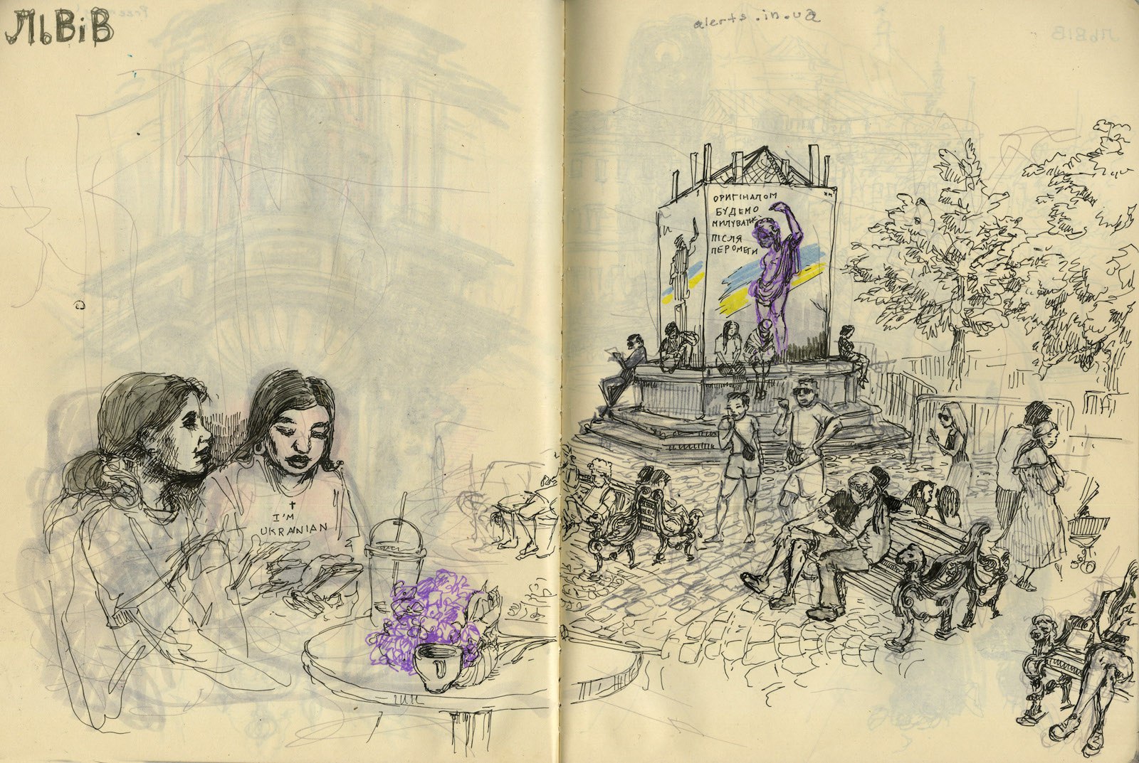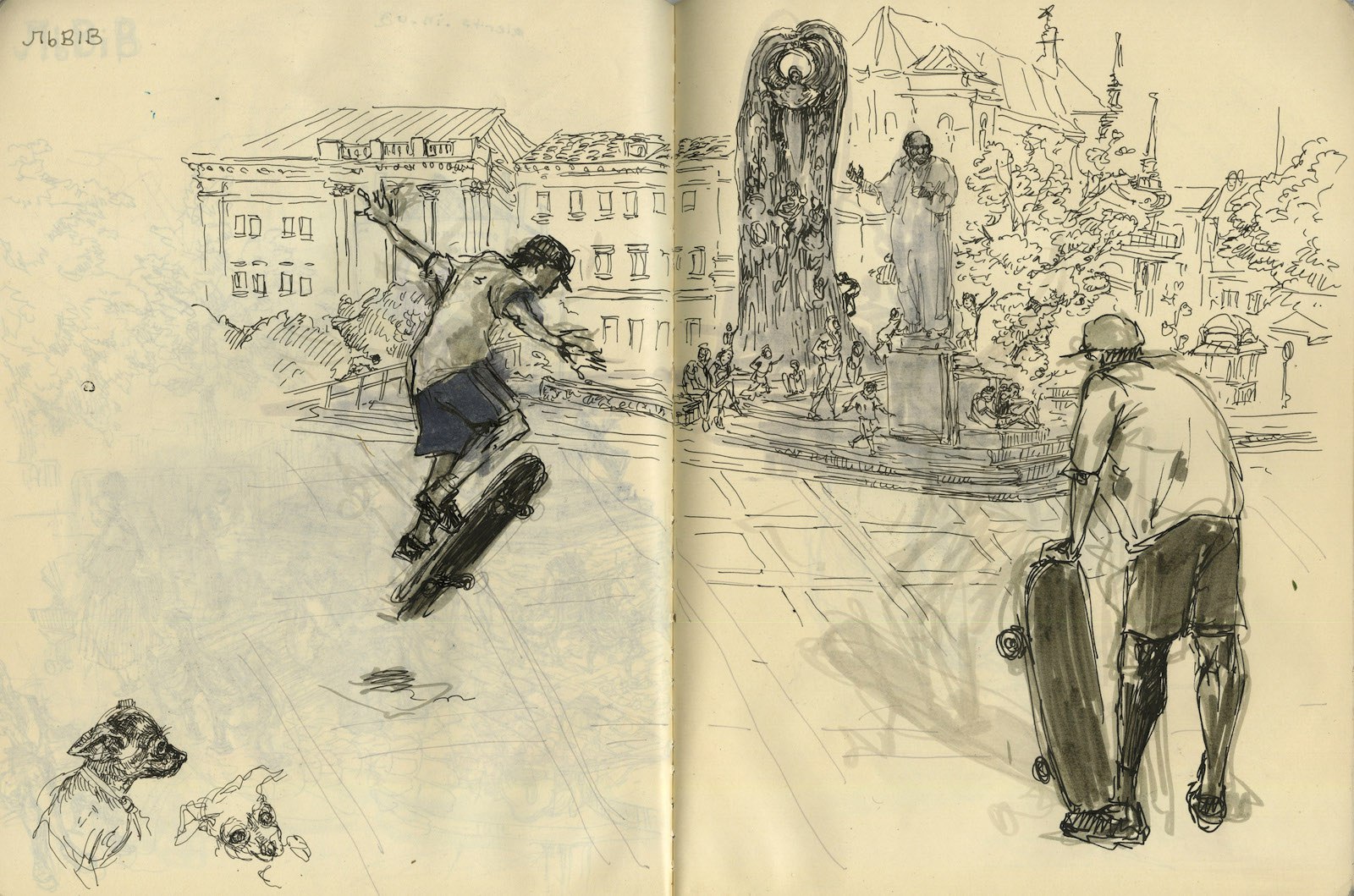 Львов, который до Первой мировой был частью Австро-Венгерской империи, — чудесный город, стильный, величественный, роскошный. На фасадах белых барочных зданий изгибаются нимфы. Фитнес-инфлюэнсеры стримят свои обеды в типичных хипстерских кофейнях. Я села на проспекте Свободы, чтобы зарисовать скейтеров, делающих кик-флипы у подножия памятника украинскому поэту Тарасу Шевченко. Сверкало полуденное солнце, воздух был теплый, как поцелуй. Не верилось, что эта страна переживает вторжение. А через полчаса взвыли воздушные сирены.