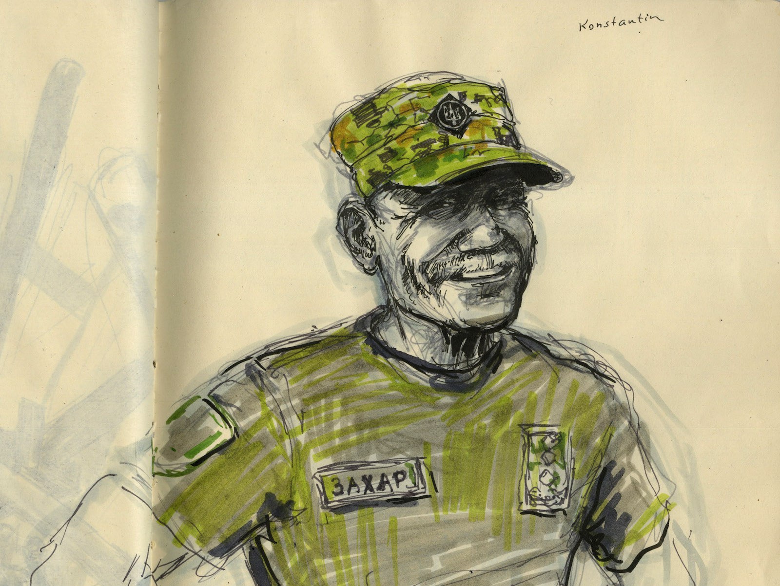 С Константином меня познакомила Анна Гречишкина, легендарная мотоциклистка, которая собиралась объехать весь мир за девять лет, но прервала путешествие и вернулась, чтобы защищать свою страну во время вторжения. Анна записалась в добровольческий батальон. Константин — ее командир. Бывший офицер, с которым Анна познакомилась, когда он был президентом одной из крупнейших ассоциаций мотоциклистов в Украине. По закону 67-летний Константин уже вышел из призывного возраста. Но он создал свой батальон, потому что все равно хочет сражаться. Я нарисовала его портрет по дороге в Бородянку, городок под Киевом, который был почти полностью разбомблен Россией при попытке взять столицу. Бомбы разрушили и много окрестных деревень, так что Анна и Константин отправились помогать одной пожилой женщине строить уличную кухню возле руин, которые когда-то были ее домом.