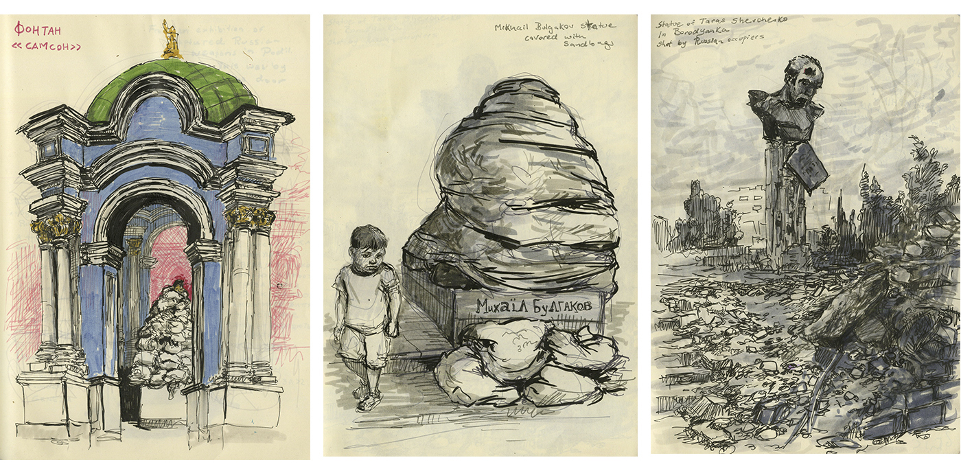 Вокруг киевских памятников — мешки с песком. На Подоле стоит барочный фонтан: Самсон раздирает пасть льву. Головы Самсона почти не видно. Советская власть уничтожила статую в середине 1930-х, потом восстановила в 1981-м, чтобы придать кварталу более исторический вид, и местные жители решили, что не допустят новой гибели фонтана. Так же надежно, несмотря на то, что он писал по-русски, защищен и сидящий в элегантной позе бронзовый Михаил Булгаков, автор «Мастера и Маргариты». Мешки с песком положили в первые дни войны, чтобы защитить скульптуры от осколков. С начала войны Россия разрушила или повредила 186 украинских достопримечательностей. В Бородянке оккупационные российские войска использовали бюст Тараса Шевченко как мишень для стрельбы.