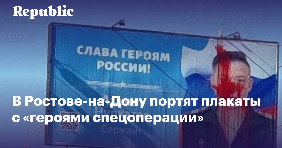 В минувшие выходные на пересечении улиц Менжинского и Российской в Ростове-на-Дону кто-то залил красной краской баннер с изображением сержанта Азамата Нуркатова. В Минобороны РФ ранее заявляли, что он получил медаль «За отвагу» за вывод группы мирных жителей с детьми из-под артиллерийского удара. Теперь он в качестве «героя спецоперации» смотрит с уличных плакатов в разных городах страны.