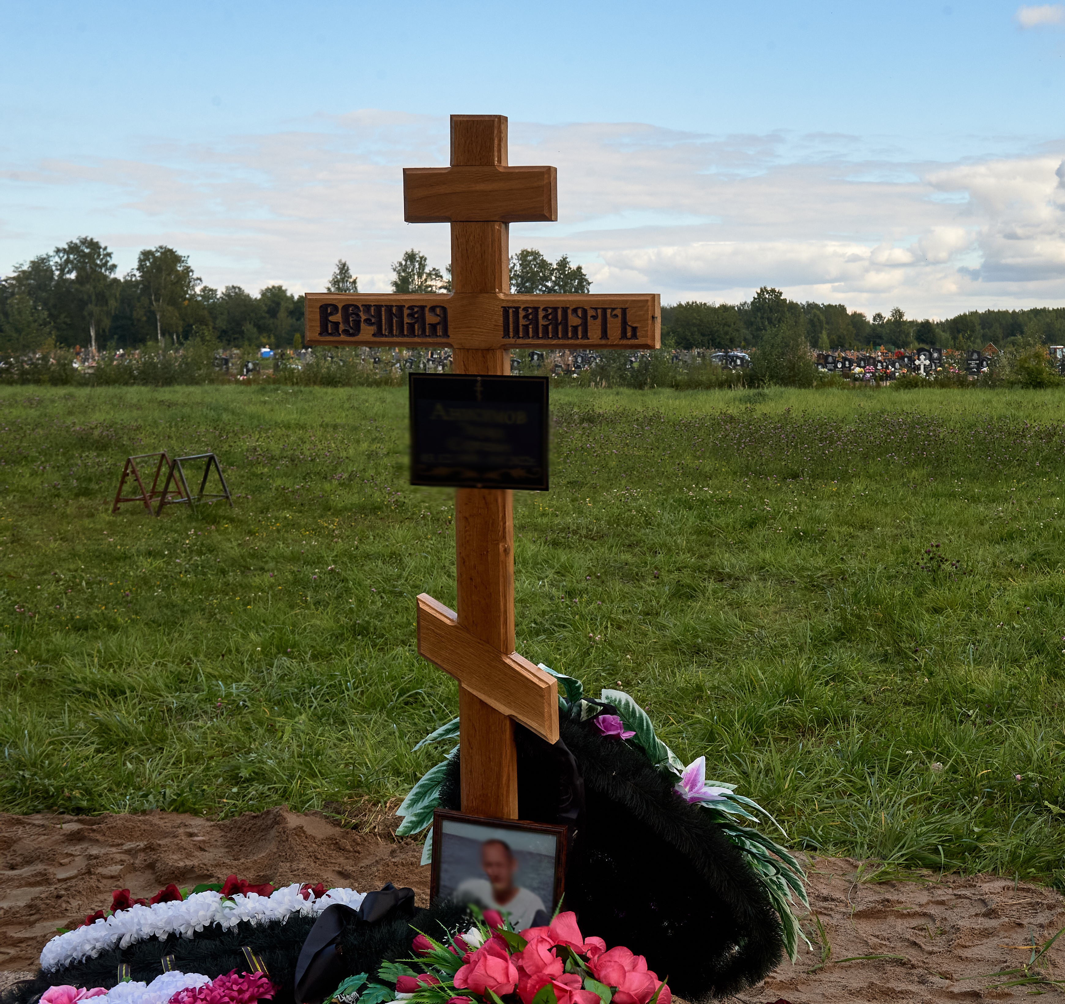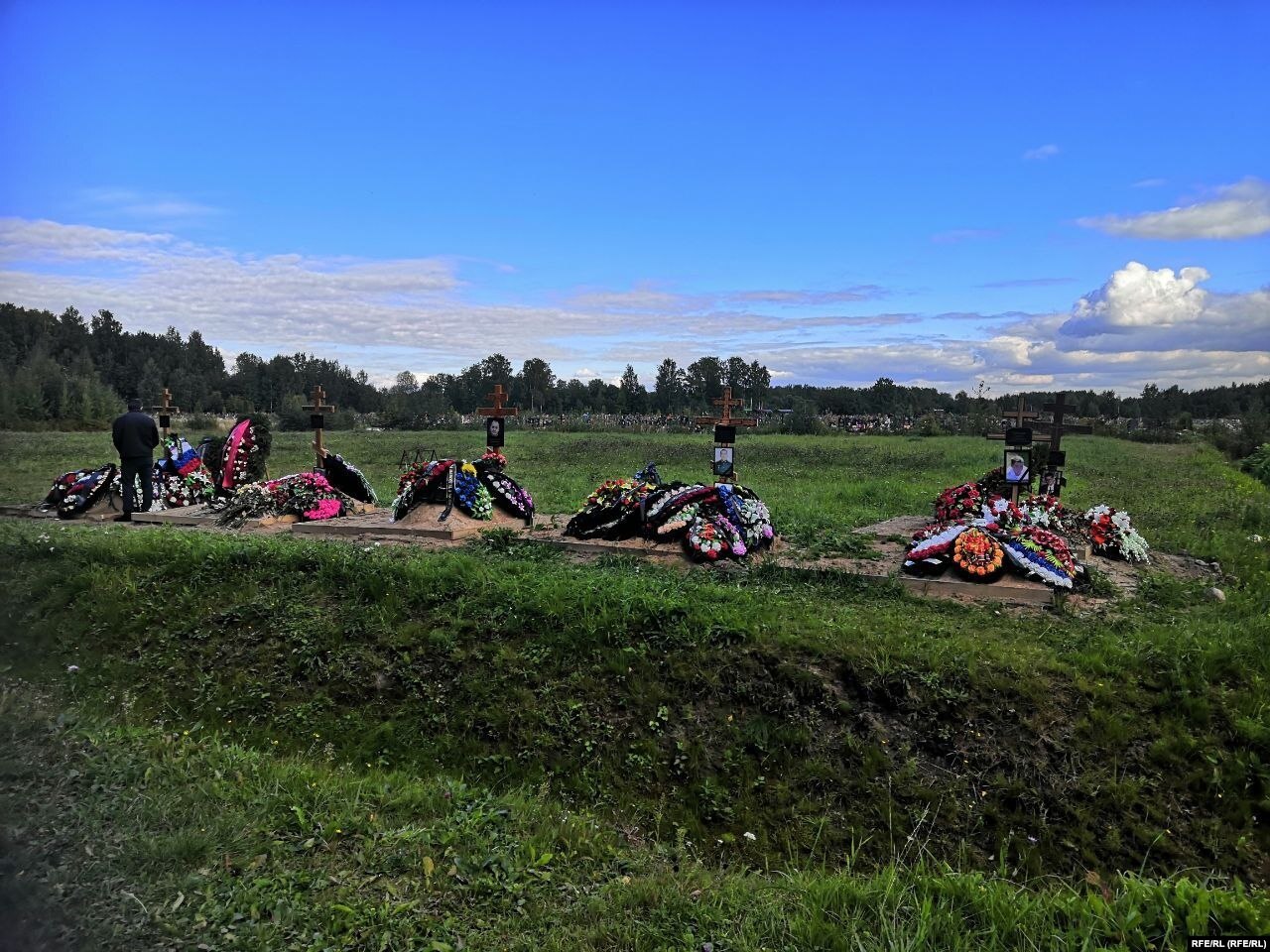 На Старопетергофском кладбище в отдалении от всех захоронений летом появились пять свежих могил: такие же, как и у всех, деревянные кресты, быстро темнеющие от дождя и солнца, черные таблички с золотыми именами и датами рождения и смерти, фотографии в рамке за стеклом с перетянутой черной лентой сбоку. Отличает эти могилы, пожалуй, только обилие живых цветов и венков, некоторые из которых выполнены в цветах российского флага.