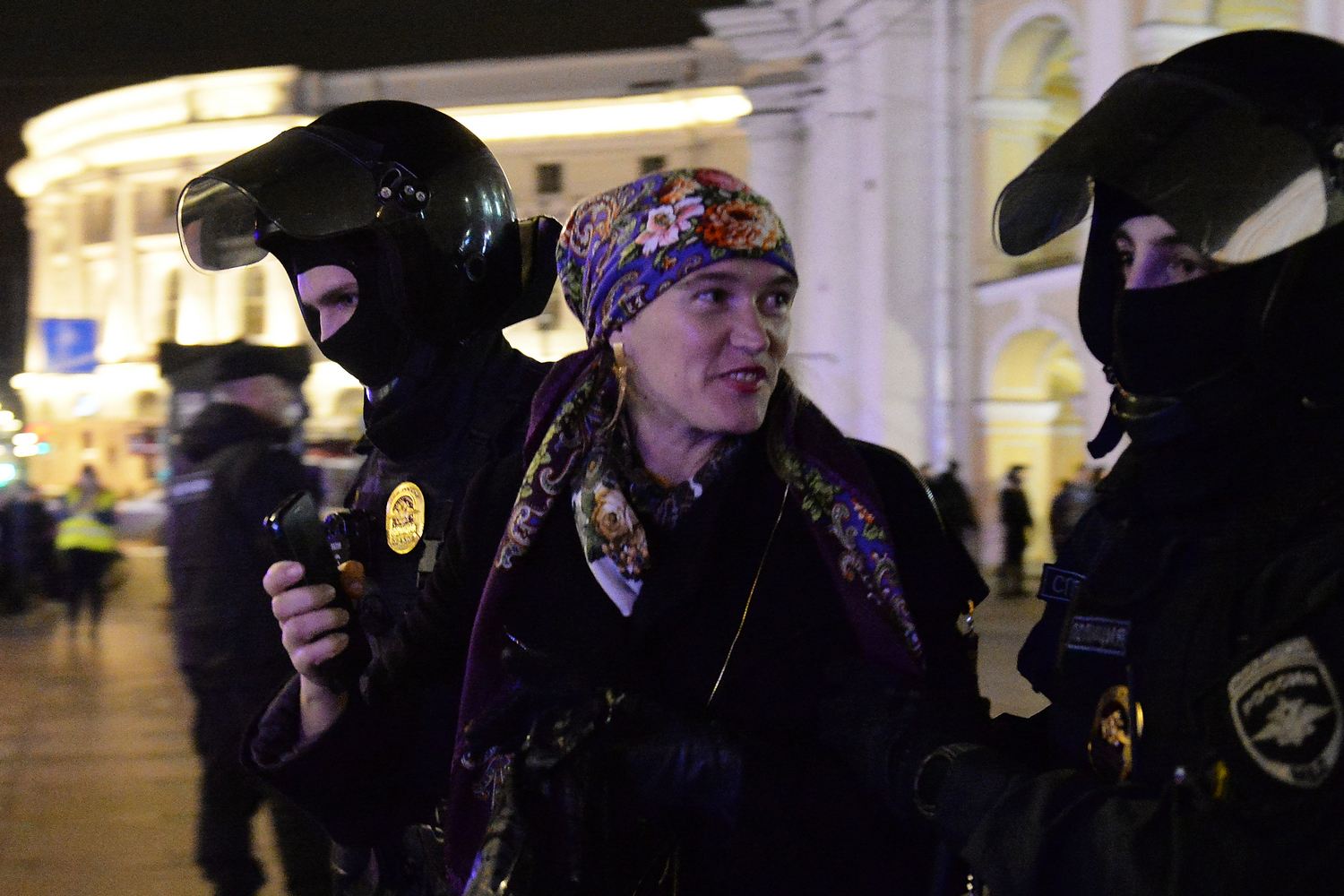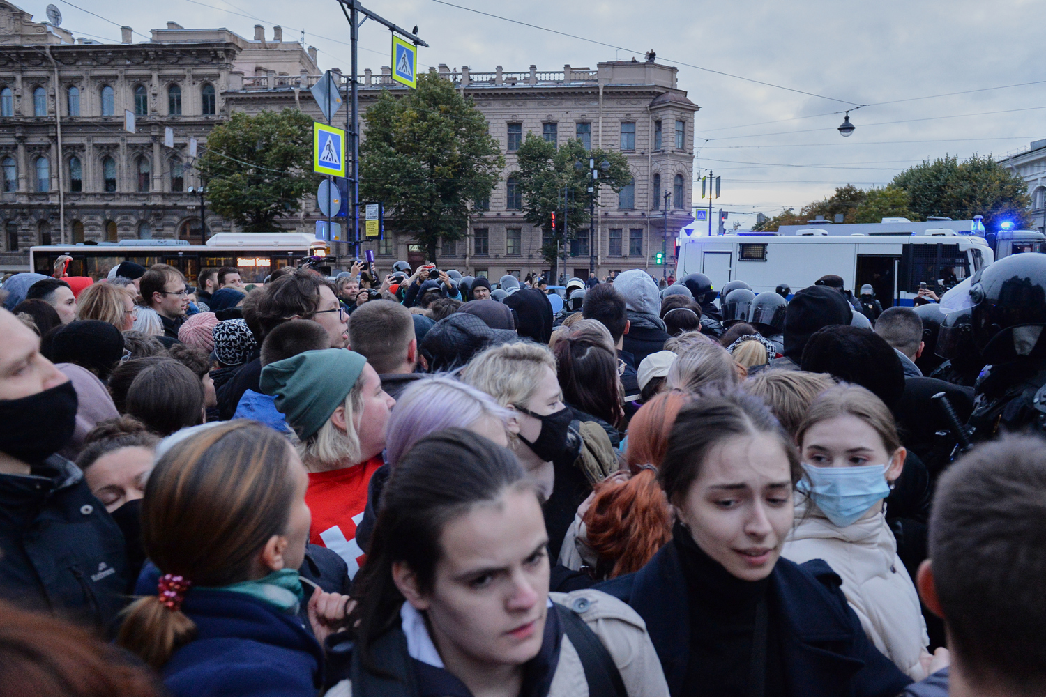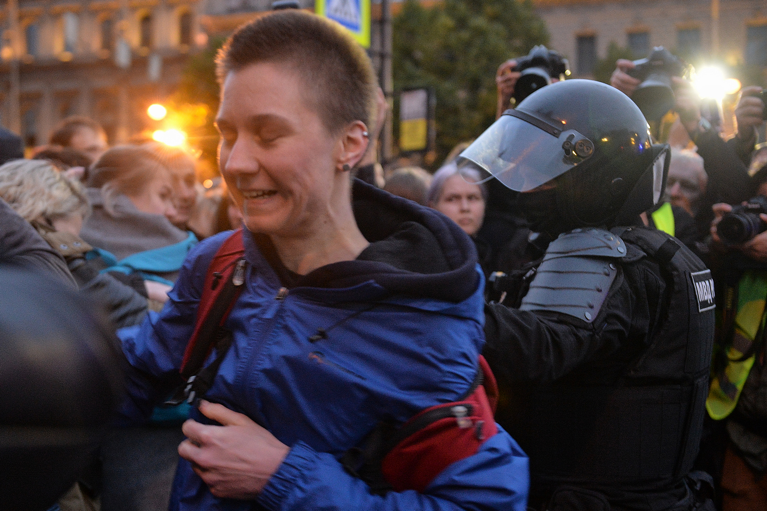 ОМОН активно задерживал участников и участниц, бил их дубинками, волок по земле и ставил на колени. По данным «ОВД-Инфо», в Петербурге задержали минимум 444 человека.