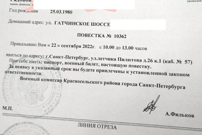 - О получении повесткок сообщают читатели «Бумаги». «У нас призвали обычного солдата 48 лет и двух возрастом чуть за 30, повестки пришли на предприятие», — рассказывает читательница «Бумаги». «Мужу на работе пришел приказ пойти в мобилизационный центр, он водитель гостранспорта. Говорят, что это ничего не значит и их, наоборот, не возьмут, но документ говорит об обратном», — делится другая читательница. Еще один читатель рассказал, что повестку ему положили под дверь.