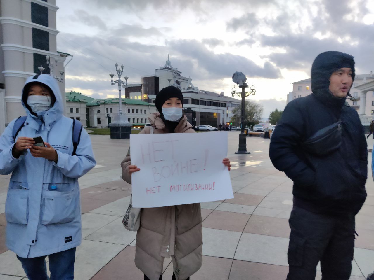 В Улан-Удэ, по подсчетам корреспондента Сибирь.Реалии, на площадь около театра оперы и балета собралось около 50 жителей. Они вышли в знак протеста против мобилизации из-за войны в Украине. Полицейские здесь также пришли в центр города к началу акции в семь вечера. Их заинтересовали плакаты протестующих, на которых были надписи "Нет войне! Нет могилизации!", "Папа не должен убивать!", "Наши братья не хотят убивать!", "Мы не хотим отпускать наших отцов и братьев, они не должны убивать!".