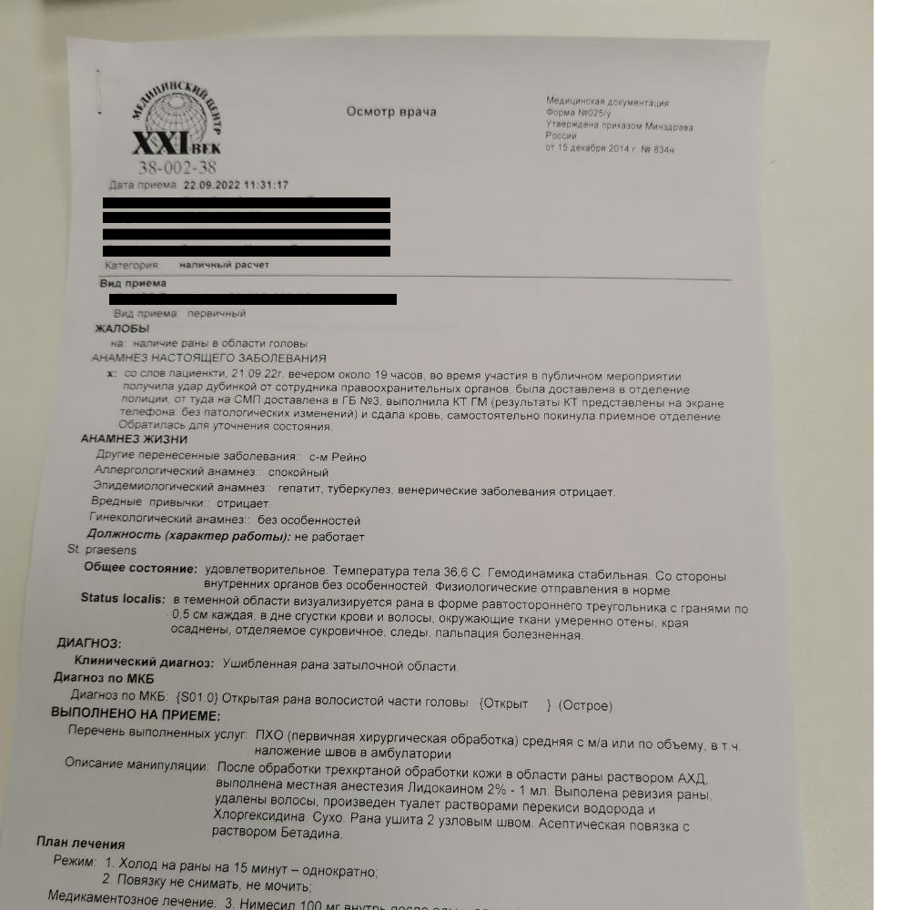 — Уже сегодня утром сотрудница «Комитета» порекомендовала идти в частную клинику и рассказать обо всем произошедшем. Тогда они зафиксировали бы в документах, что меня дубинкой ударил сотрудник полиции во время митинга, и из-за физического состояния я не должна была бы явиться на рассмотрение моего административного дела. В частной клинике мне попались адекватные люди, написали всё как нужно. Они также обработали мне рану, только сказали, что я поздновато пришла. Ну, к сожалению, не было такой возможности [прийти вовремя]. Врач также наложил мне швы, посмотрел на КТ и подтвердил, что сотрясения нет.