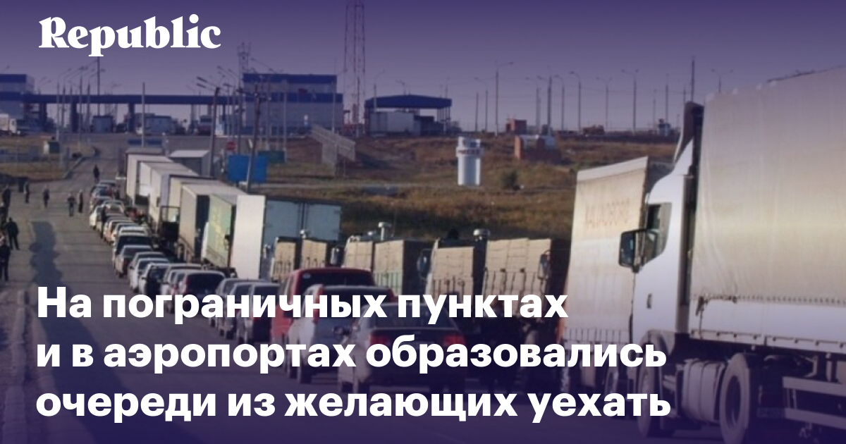 После объявления Владимиром Путиным частичной мобилизации на пограничных пунктах с Казахстаном, Финляндией, Монголией и Грузией образовались многокилометровые пробки из автомобилей. Очереди из желающих покинуть страну также замечены в аэропортах. Российские и зарубежные СМИ публикуют сегодня соответствующие видео и фото.