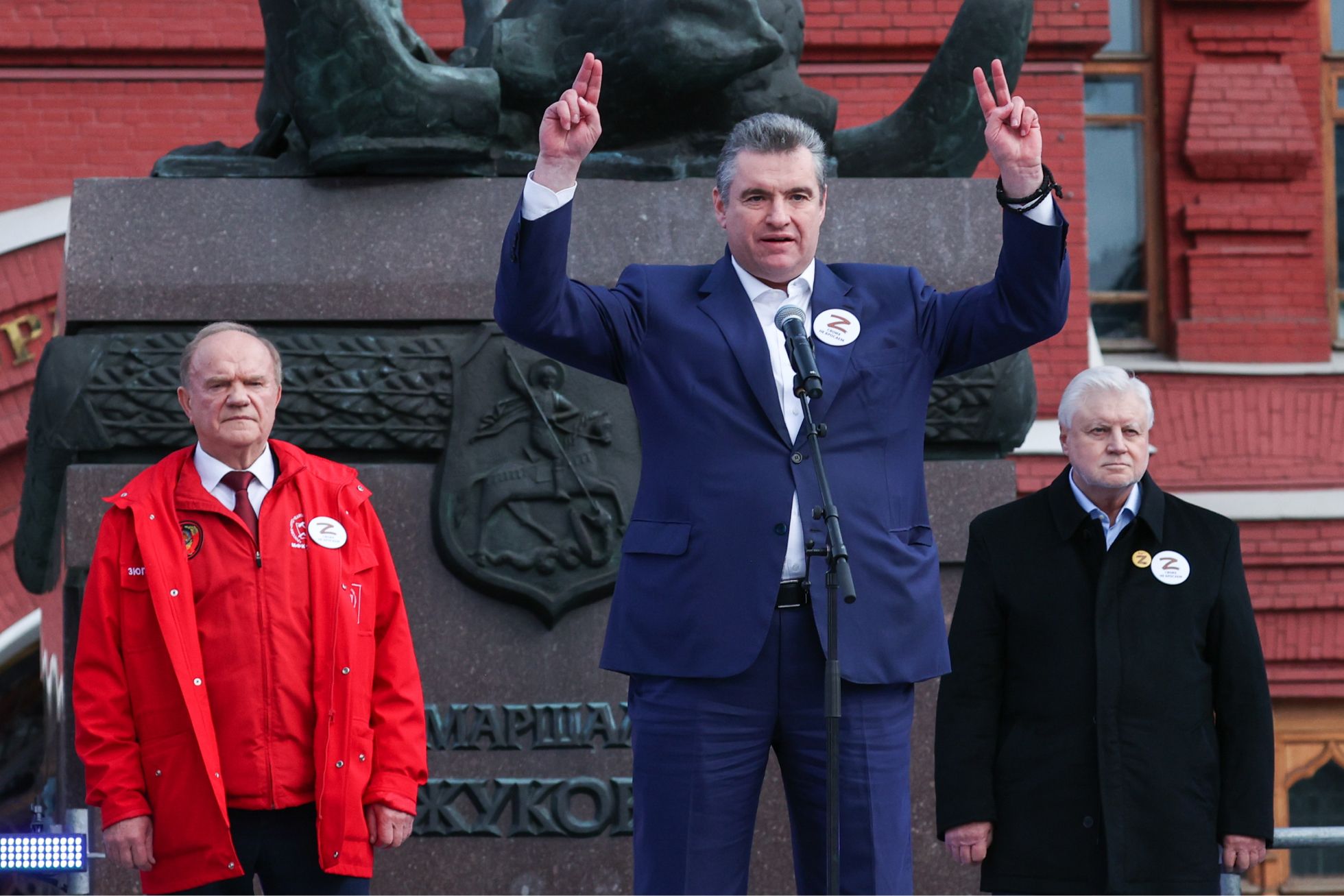 — Украинским нацистам позор, позор, позор! — кричит Слуцкий, но толпа его не поддерживает. Лидер ЛДПР не смущается и призывает выбрать «великий русский мир» и дать отпор США: — Сегодня мы должны дать ответ коллективному Западу. Россия поддерживает мир. За мир!