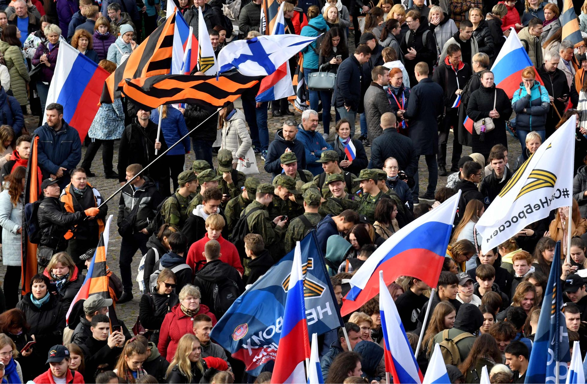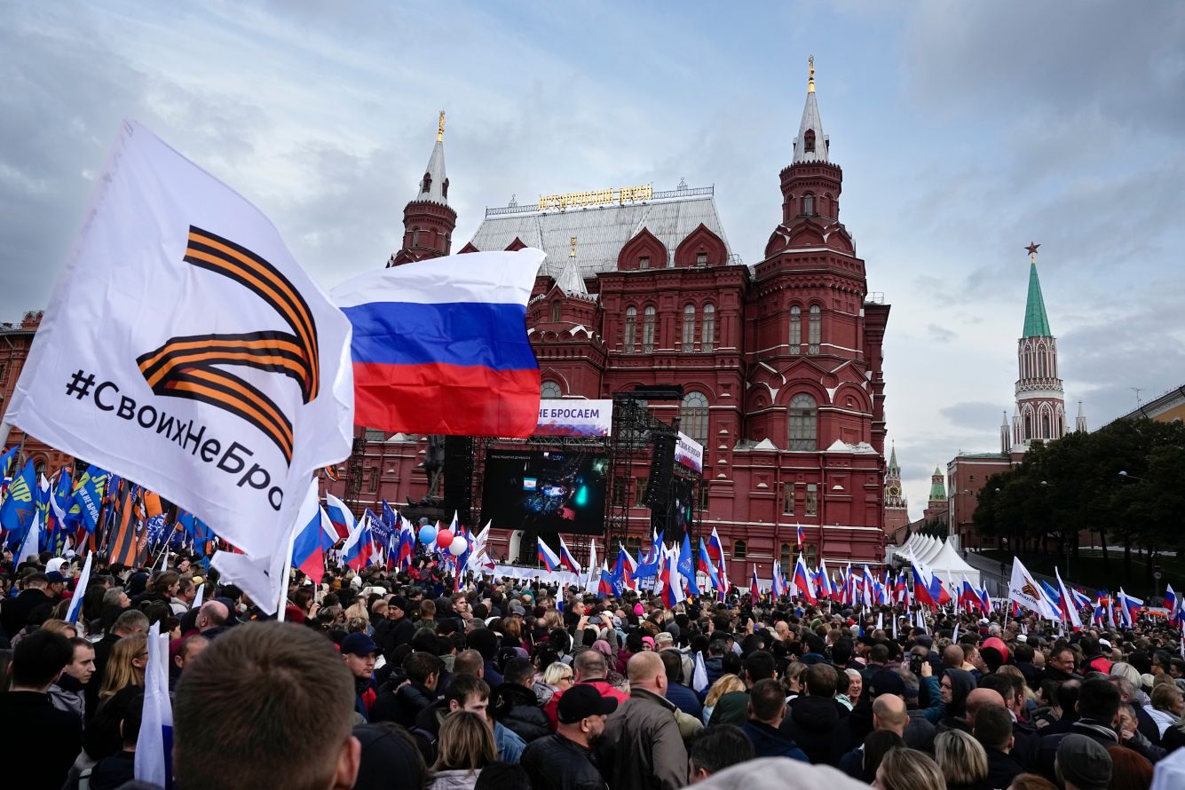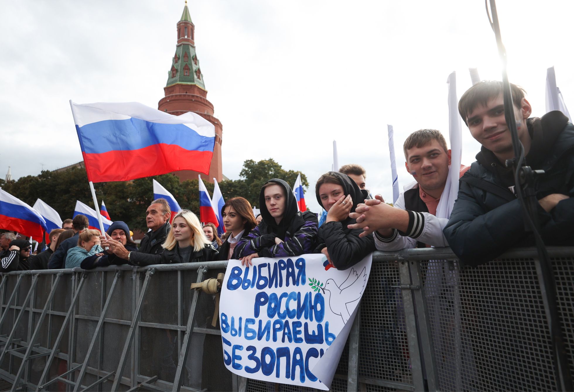 На Манежной площади прошел митинг-концерт в поддержку «референдумов». На нем под песни Чичериной хвалили Путина и радовались мобилизации. Репортаж «Медузы»
