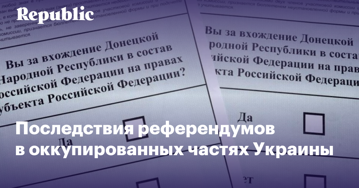 В самопровозглашенных Луганской и Донецкой народных республиках (ЛНР и ДНР), Херсонской и Запорожской областях сегодня стартовали референдумы о присоединении к России. Власти оккупированных регионов Украины приняли решение проводить голосование в течение пяти дней — до 27 сентября. Президент Украины Владимир Зеленский говорил, что такие референдумы закроют возможность для переговоров между Киевом и Москвой. Что они дадут самой России — вопрос открытый. Помимо новых земель, границ и граждан, плебисциты могут привести также к военному положению, подробнее об этом — в материале Republic.