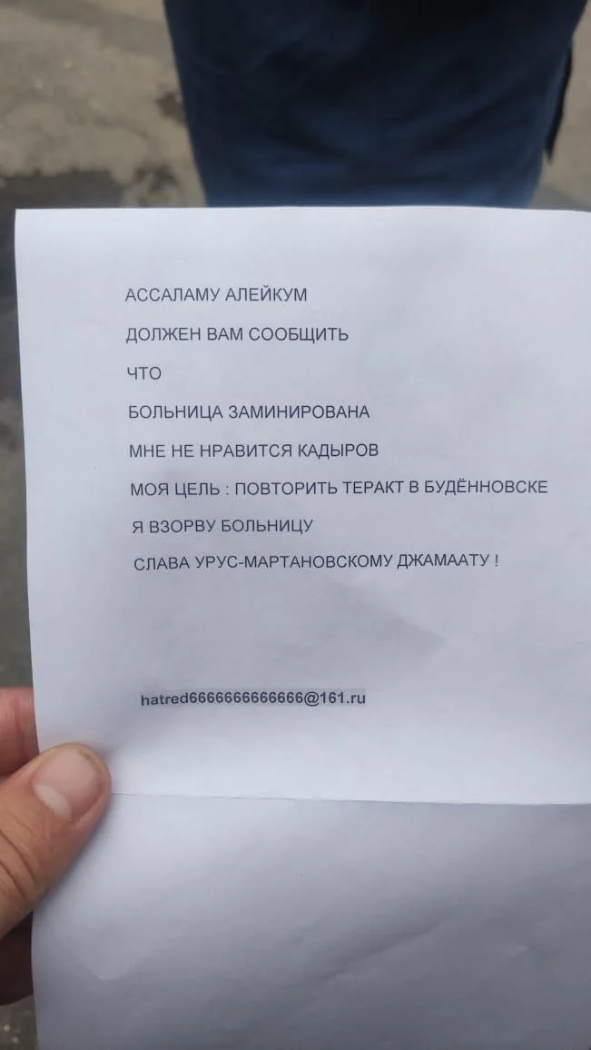 Записка формата А4 с текстом-угрозой повторить теракт в Буденновске (в 1996 году чеченскими сепаратисты во главе с Шамилем Басаевым захватили больницу и более 2000 заложников) поступила в больницу пока не установленным способом, но не по электронной почте. Главный врач больницы дал распоряжение о срочной эвакуации персонала и больных, включая новорожденных детей. При этом он предупредили, что данная ситуация «не учения».