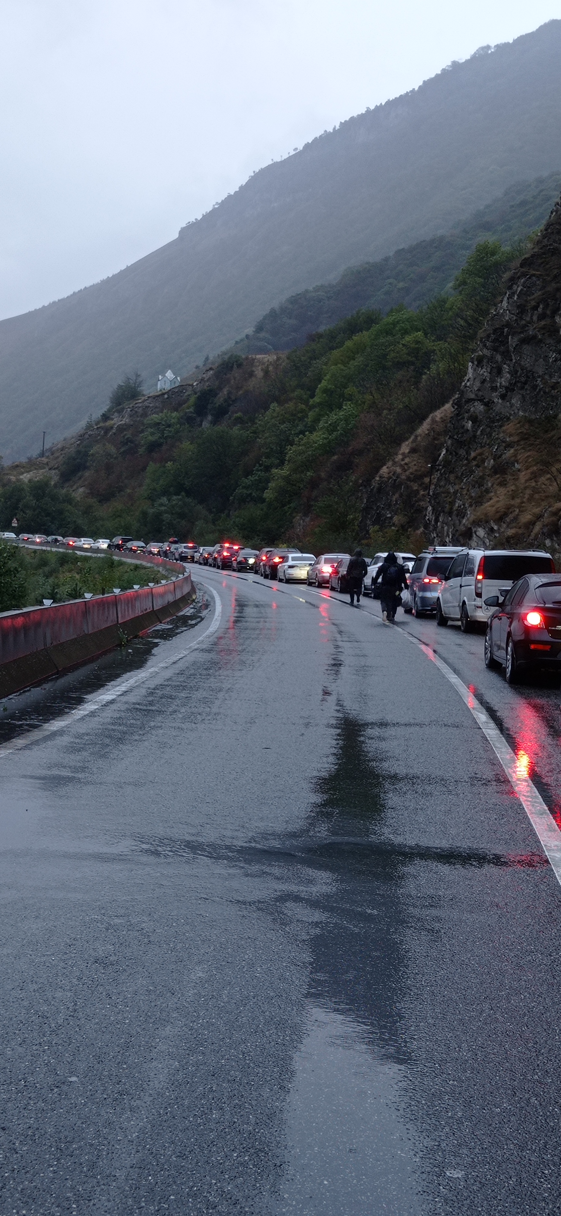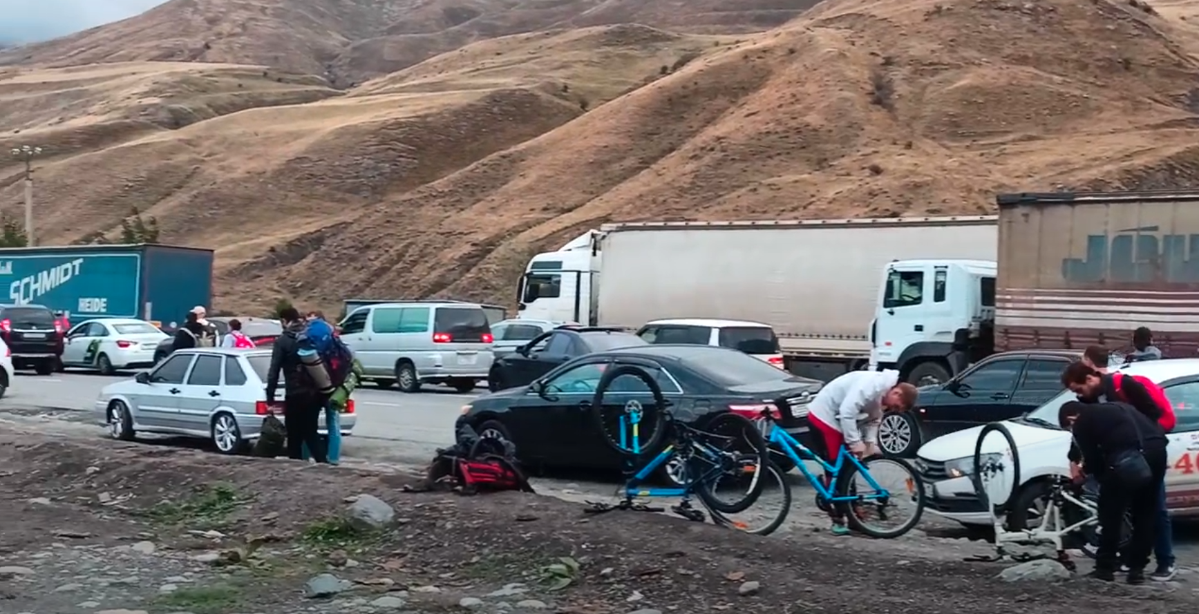 – Но по факту мы больше суток пытались проехать один километр! – рассказывает Денис. – Это на въезде в Северную Осетию. Гаишники нас развернули, мы пытались через реку, пытались через поле. У нас сломалась машина – разорвало колесо на скорости, чуть не задели другую машину. Доблестный гражданин [инспектор] просил за проезд 60 тысяч. Поняли мы, что не объехать этот пост… Встали в пять утра, в итоге я пошел пешком – и прошел пост в час дня (24 сентября. – Прим. ред.). Там поймал попутку и поехал во Владикавказ. Эта пешая прогулка была только разминкой – когда доехали до пробки к Ларсу, там пешком пришлось идти около шести часов. Километров 25–27 серпантина. А если не хочешь – вставай в очередь! Либо, если знаешь, кому бабки заплатить, тебя поближе пододвинут.