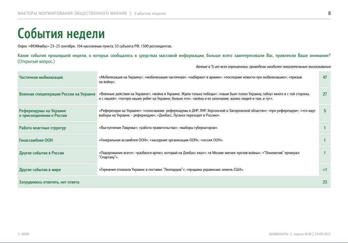 Главными событиями недели опрошенные назвали "частичную мобилизацию" (47%), "специальную военную операцию" (27%) и "референдумы о присоединении к России" (5%).