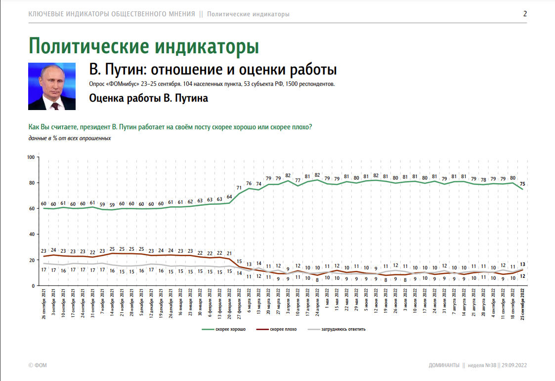 Работу Владимира Путина на посту президента РФ положительно оценили 75% россиян. За последнюю неделю этот показатель упал на пять процентных пунктов.