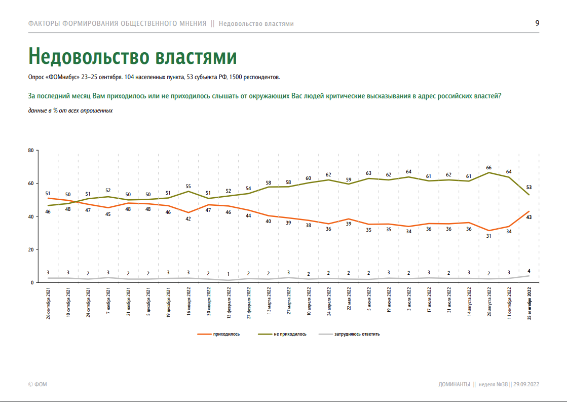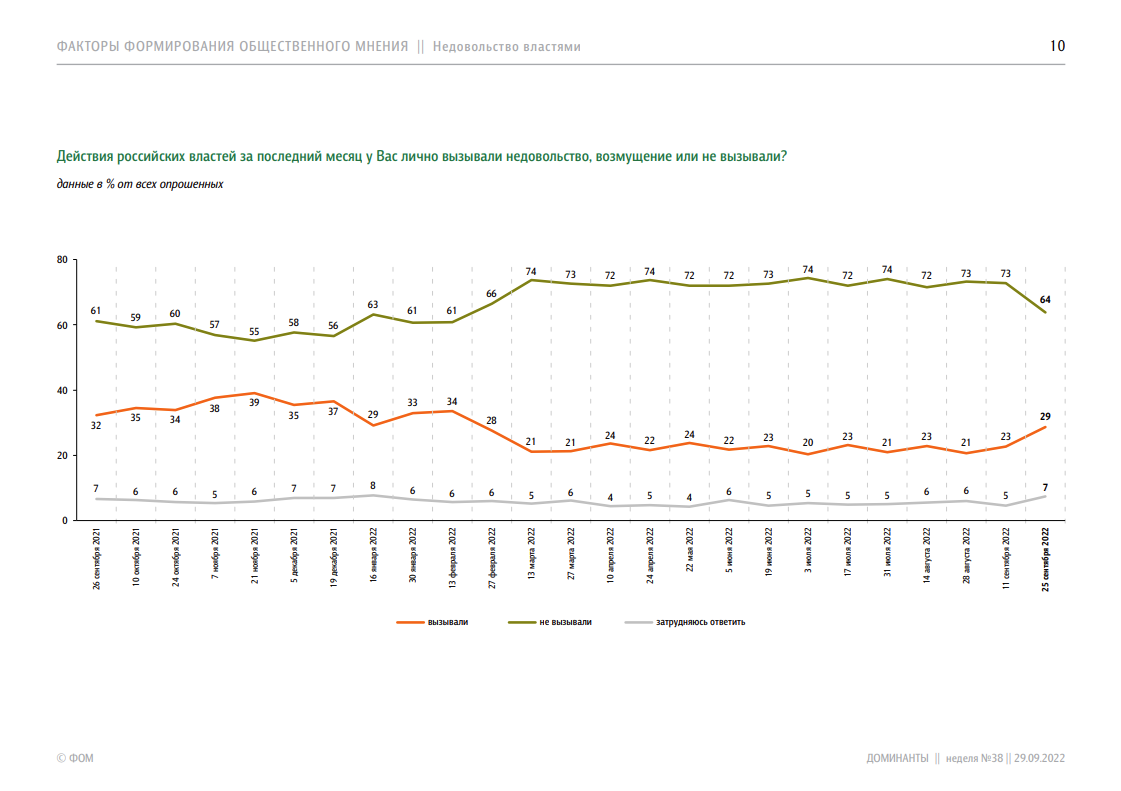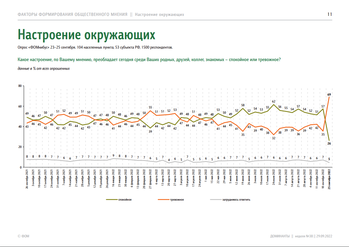 25 сентября на вопрос о том, какое настроение преобладает среди ваших родных и знакомых, 69% опрошенных ответили "тревожно"е. Неделей ранее, 18 сентября, так отвечали почти вдвое меньше респондентов — 35%.