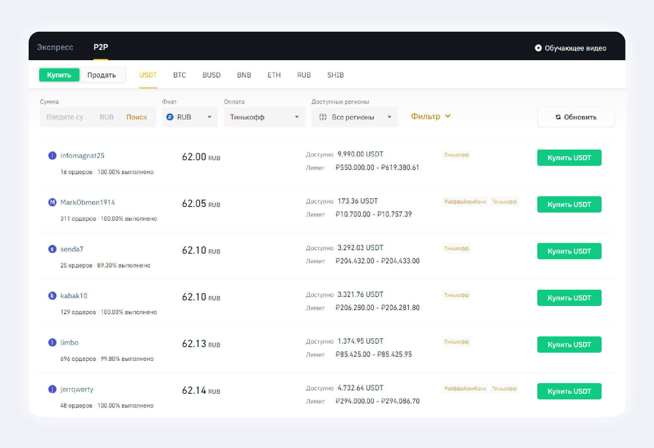 С помощью этого сервиса продавцы и покупатели взаимодействуют напрямую, а Binance облегчает транзакции и защищает сделки, выполняя арбитражные функции. Приобрести криптодоллары USDT и другие криптовалюты на P2P-платформе Binance можно за разные валюты, для каждой из которых существуют свои способы оплаты.