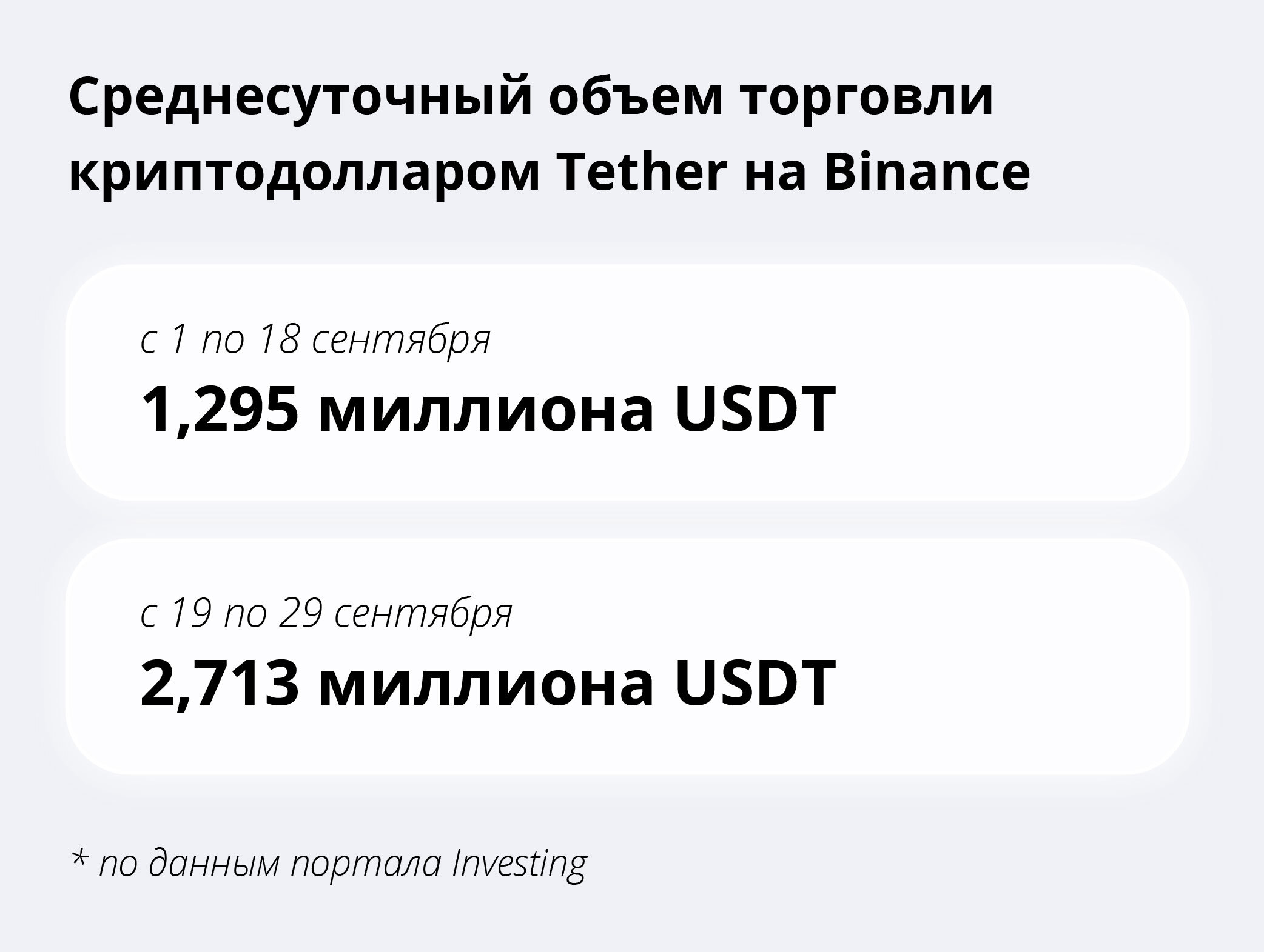 Судя по этой статистике, после объявления мобилизации спрос на криптодоллары вырос. Например, на Binance после 19 сентября среднесуточный объем торговли USDT вырос более чем вдвое к показателям первой половины месяца.