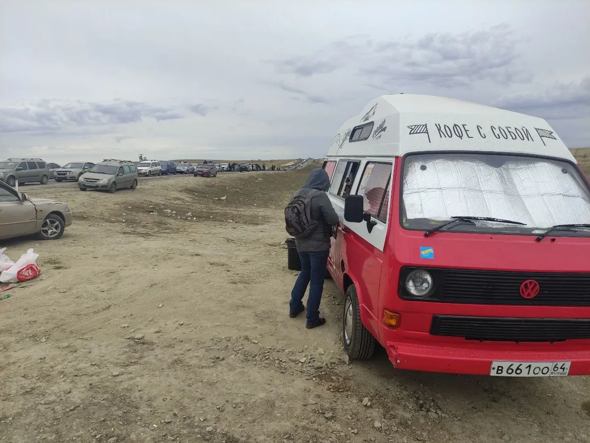 На машине собеседника — подмосковные номера. Пробка не движется часа два. Мужчина с водителями из соседних легковушек, разложив на обочине газовую горелку, греет кастрюлю воды для чая. Ребята притопывают, плотнее затягивают капюшоны — в степи дует сильный холодный ветер.