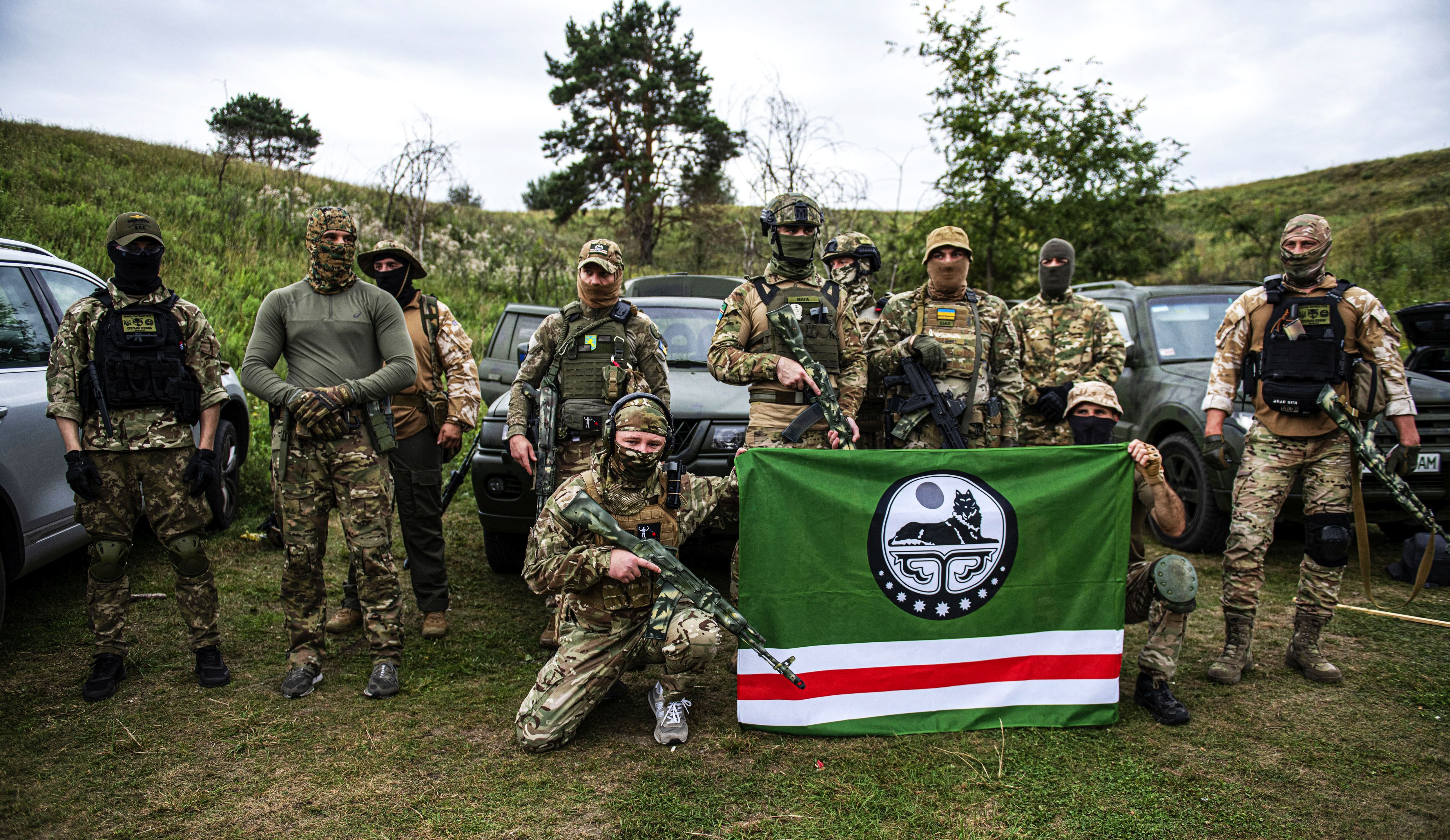 Бойцы батальона имени Джохара Дудаева, воюющие на стороне Украины в войне с Россией во время военной подготовки недалеко от Киева, 27 августа 2022 года