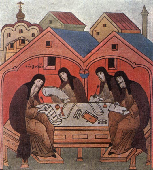 Писцы книг. Миниатюра из лицевого Жития преподобного Сергия Радонежского. XVI век. Епифаний Премудрый изображен слева
