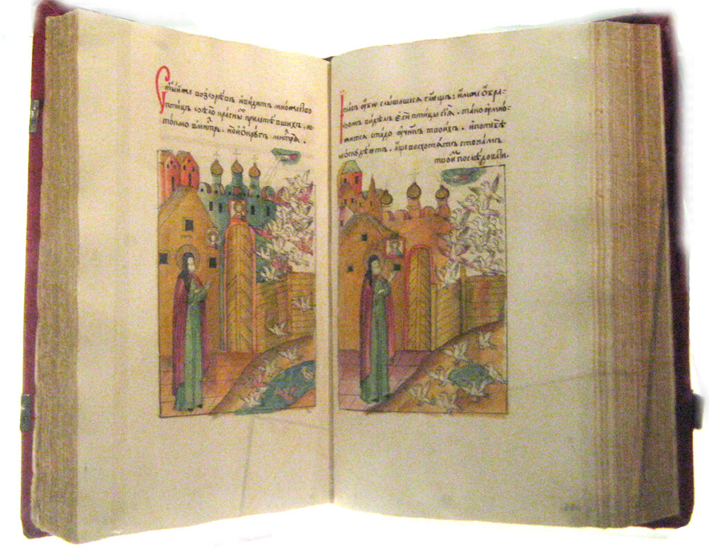 Житие преподобного Сергия Радонежского. На раскрытой странице изображено чудесное видение множества птиц