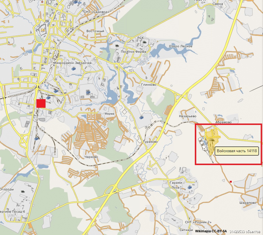 Красный квадрат слева – место, где "ядерный поезд" попал на видео. В красном прямоугольнике – войсковая часть 14118, откуда он выехал