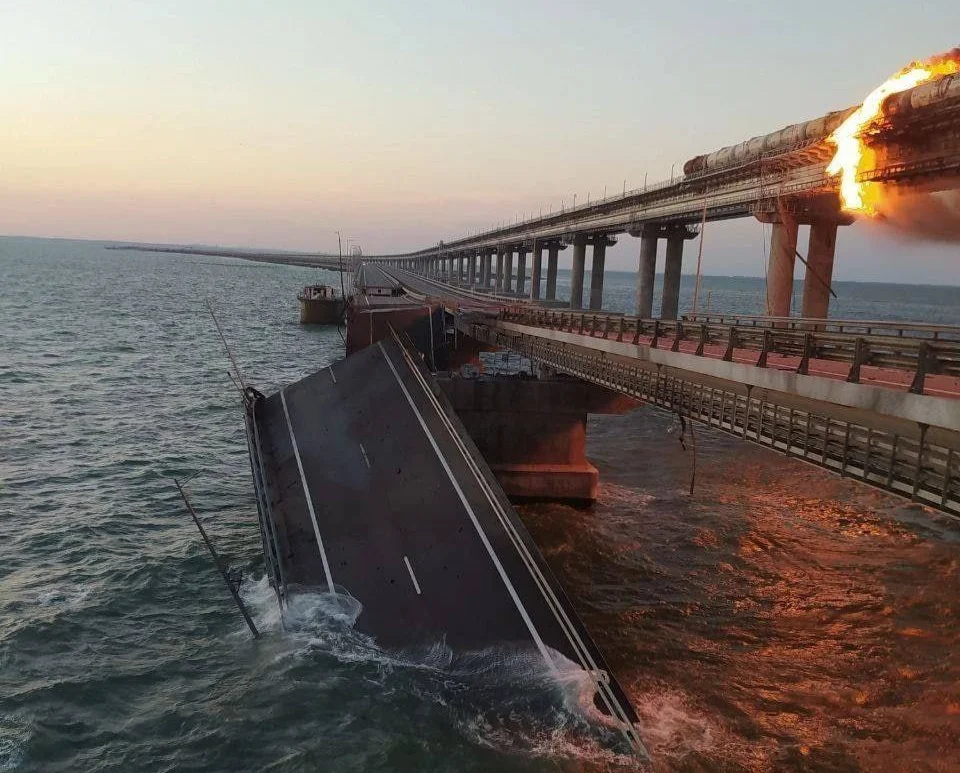 Ранее сегодня на Крымском мосту произошел взрыв. В это время по мосту проходил товарный поезд с горючими материалами. Он загорелся. Судоходные арки моста не были повреждены.
