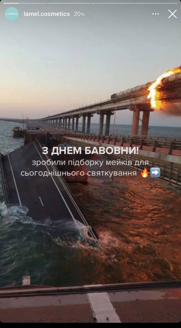 После взрыва на Крымском мосту в инстаграме Lamel появилась сториз с надписью и фотографией горящего моста. Дальше бренд советовал оранжевый карандаш для глаз для «огненных» стрелок. Через некоторое время сториз удалили.