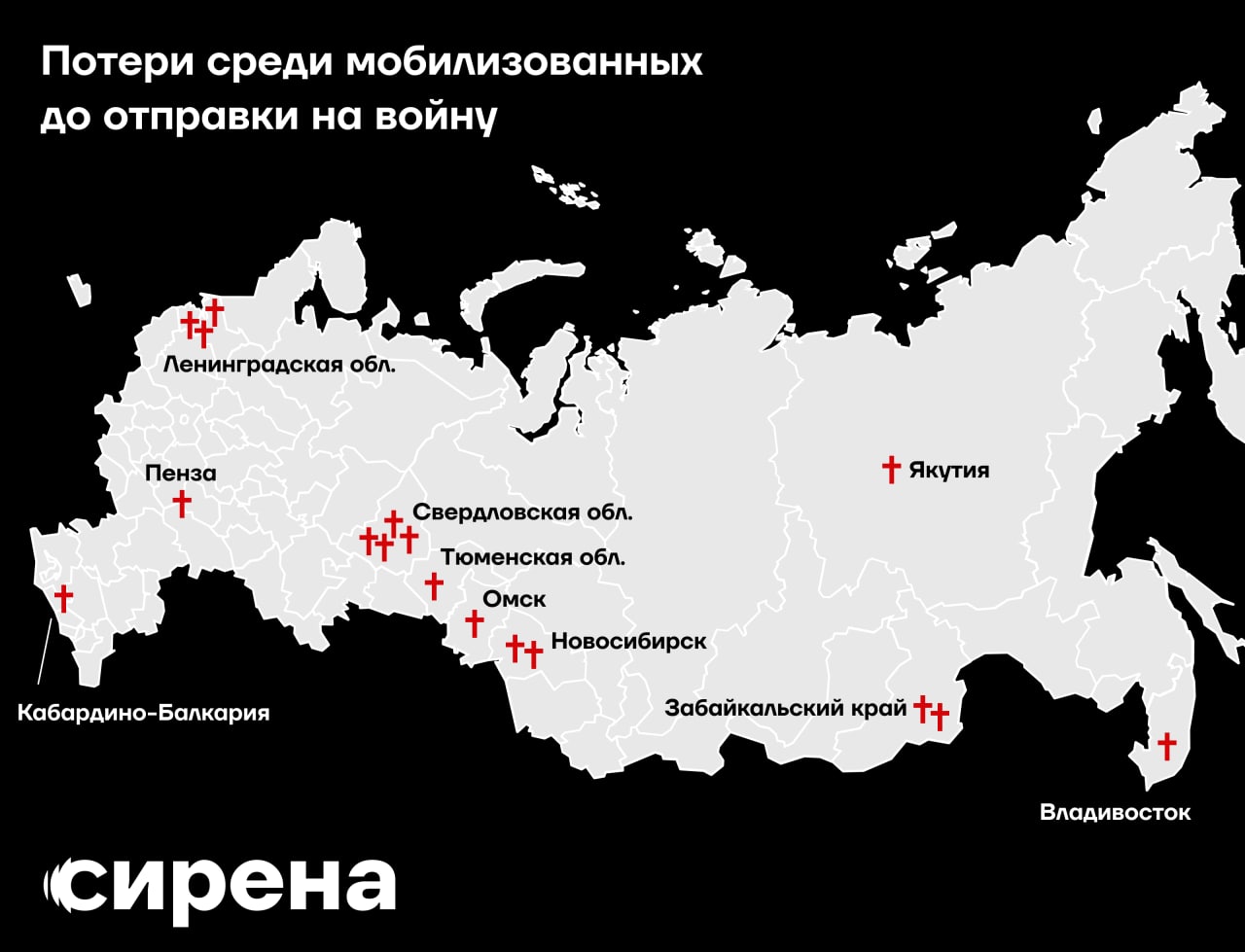 Всего известно о минимум 17 случаях смерти мобилизованных не доехавших до фронта или приграничных регионов. Издание "Сирена" делало карту смертей.