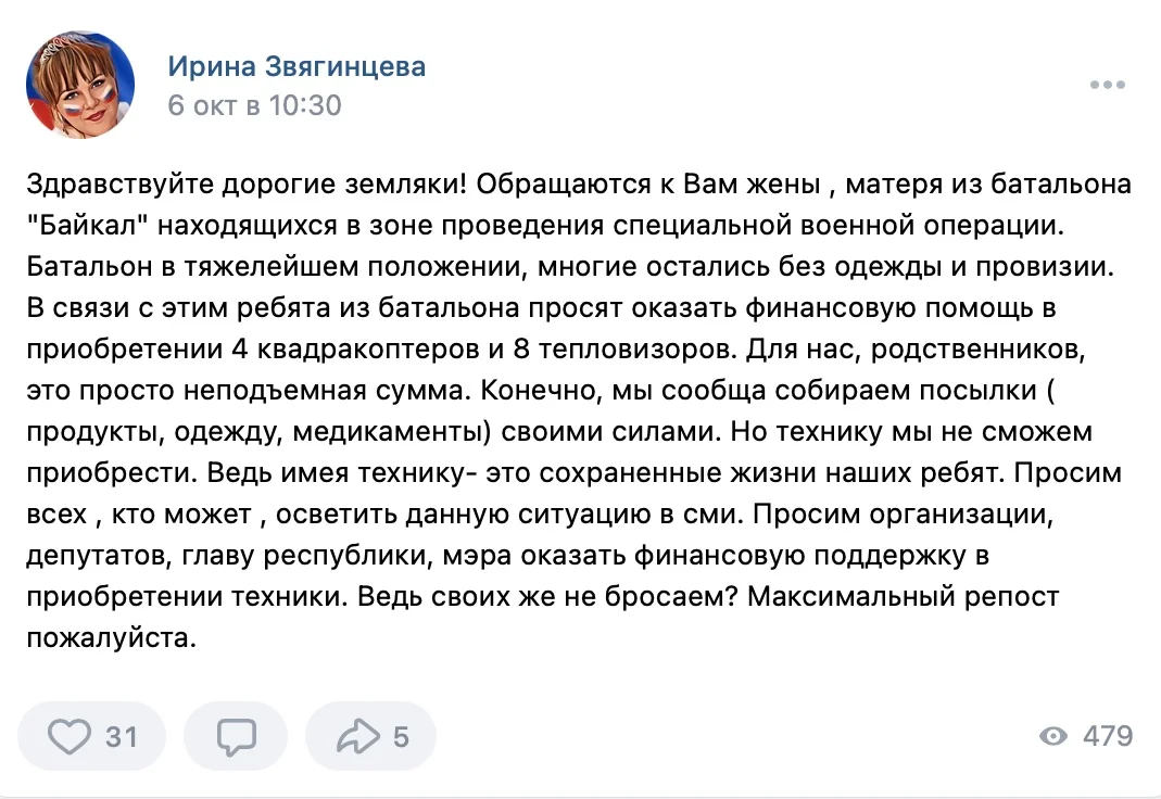 39-летняя Ирина Звягинцева из Улан-Удэ 6-го октября опубликовала пост ВКонтакте о сборе денежных средств для батальона «Байкал»: