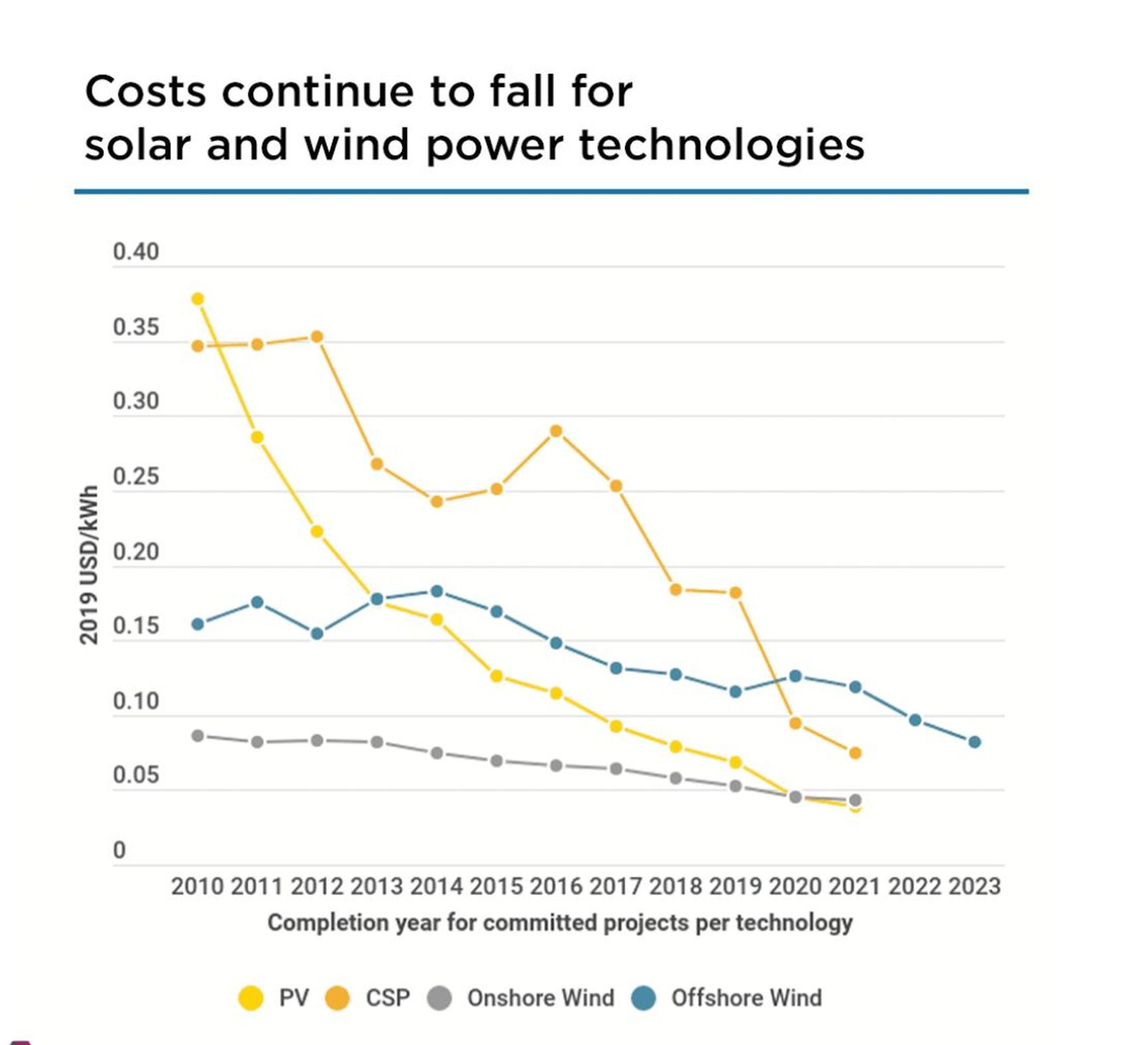 По данным Международного агентства по возобновляемым источникам энергии IRENA, с 2010 по 2020 год стоимость электроэнергии от солнечных фотоэлектрических систем общего назначения снизилась на 85%, от систем концентрированной солнечной энергии (CSP) — на 68%, от наземных ветряных турбин — на 56%, от офшорных — на 48%.