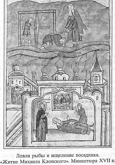 В агиографических памятниках его называют „уродивым Христа ради“, но, как кажется, в нем преобладают черты юродивого в житейском смысле. Михаил Клопский не склонен к юродскому анархизму и индивидуализму, он строго и неукоснительно исполняет монашеские обязанности, вытекающие из иноческого устава. Дары пророчества и чудотворения, которые приписывают Михаилу Клопскому авторы житий, прямой связи с подвигом юродства не имеют и, таким образом, на него не указывают: такими дарами, с точки зрения церкви, мог быть наделен равно затворник и столпник, пустынножитель и юродивый. Склонность к обличению сильных мира („ты не князь, а грязь“), усиленная в тучковской редакции жития Михаила Клопского, разумеется, свойственна человеку, избравшему „юродственное житие“. Обличительство есть следствие подвига юродства, но установление обратной причинной связи (обличитель — значит юродивый) — логическая ошибка. Самое главное заключается в том, что Михаил Клопский ведет жизнь благочестивого монаха, совсем не похожую на скитания „меж двор“, которые столь характерны для юродивых. <...> Хотя оттенок юродства ощутим в его загадочных ответах при первой встрече с братией Клопского монастыря <...>, все-таки он не может быть признан каноническим типом юродивого».