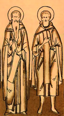 Преподобные Феодосий Великий и Михаил Клопский. Рисунок в Строгановском лицевом иконописном подлиннике. Кон. XVIII в. (?) Источник