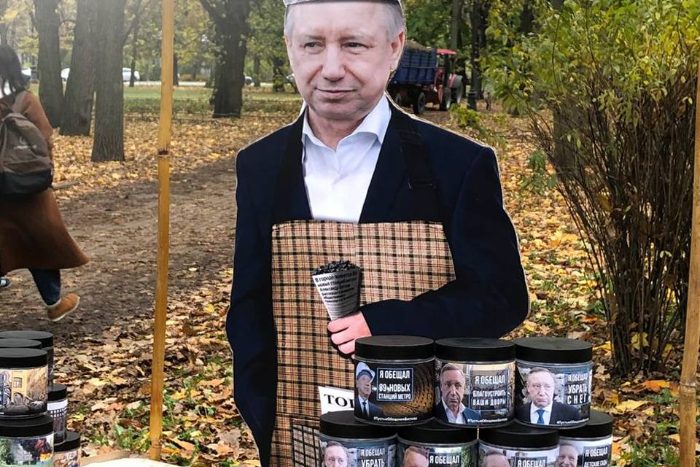 Петербуржцы поставили в Александровском саду картонную фигуру Беглова, а на столе перед ней — банки с обещаниями губернатора: например, «89 новых станций метро», «благоустроить ваши дворы», «убрать снег», «комфортный транспорт», «сохранить архитектуру Петербурга», «детские сады и школы» и другие.