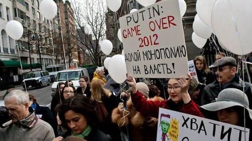 Мария Вьюшкова в 2012 году на митинге в Нью-Йорке с плакатом «PUTIN: GAME OVER 2012 ДОЛОЙ МОНОПОЛИЮ НА ВЛАСТЬ»