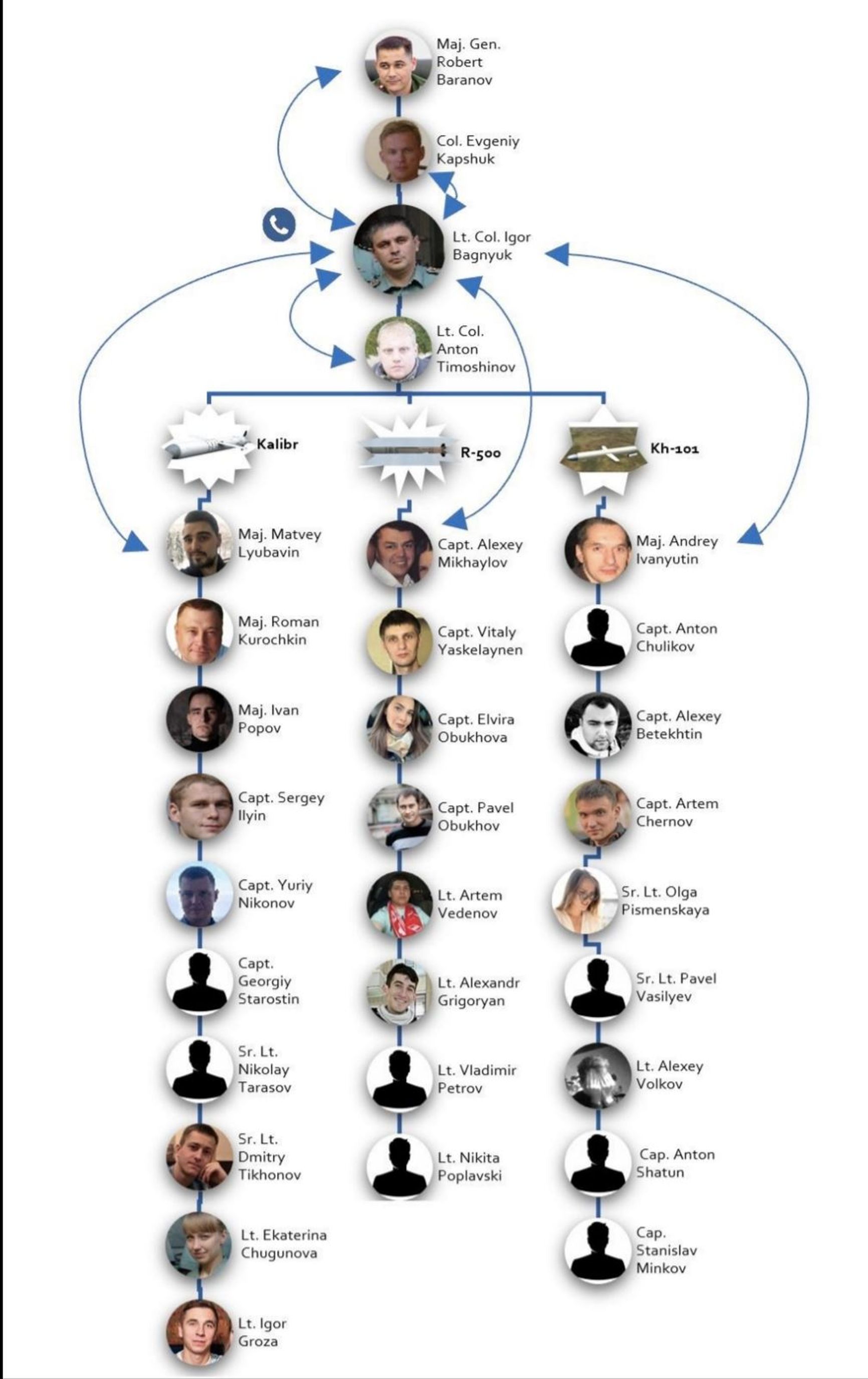 Visual evidence and photographs of missile remnants show that many, if not all, of the missiles fired on October 10 and 11 October were sea-launched Kalibr cruise missiles (3M-14), land-launched R-500 (9M728) for Iskander complexes, and air-launched Kh-101 type missiles. These are positioned by the Kremlin as «high-precision» weapons that hit only targets of military significance. However, since the beginning of the Russian invasion, long-range cruise missiles have repeatedly destroyed civilian infrastructure and resulted in the death and injury of hundreds of civilians. Either those missiles did not follow a pre-programmed flight path, the targeting was based on unreliable intelligence, or the destruction of civilians was the Kremlin's true objective. In any event, those responsible for targeting and launching those missiles are war criminals who were well aware of the consequences of their actions. We managed to establish their names and positions.