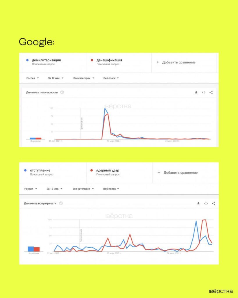 Россиян перестали интересовать «денацификация» и «демилитаризация», зато выросло число поисковых запросов об «отступлении» и «ядерном ударе» - Вёрстка
