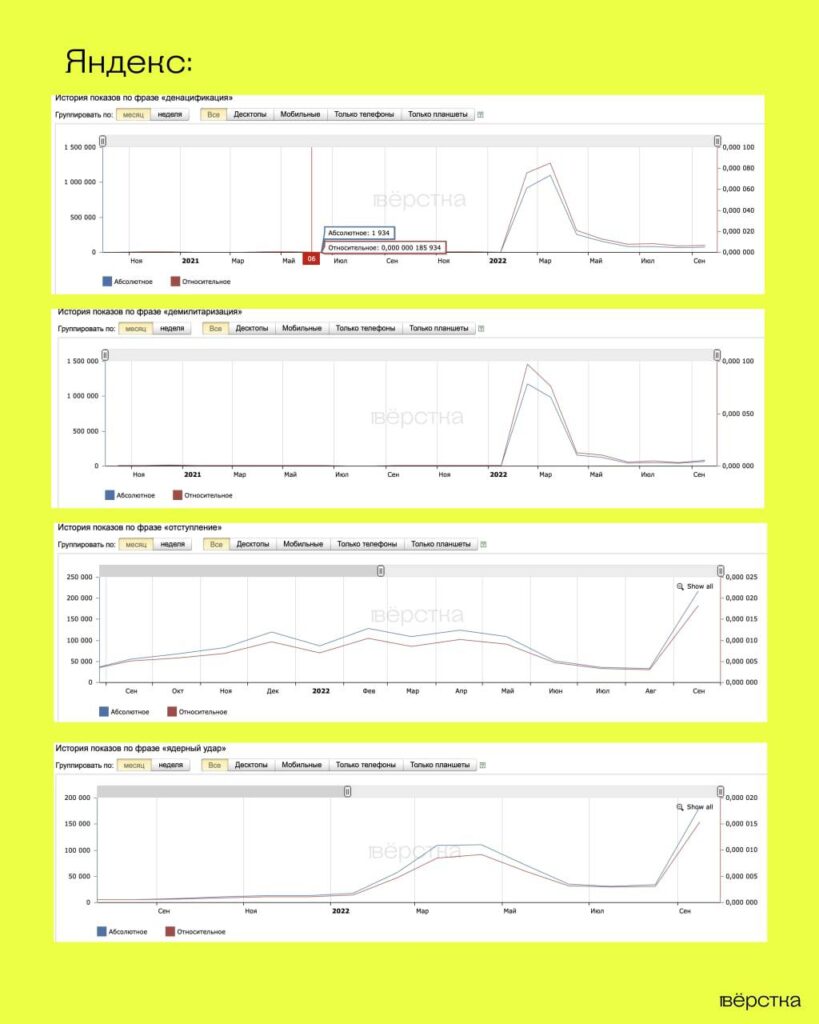 Это подтверждают и данные сервиса «Яндекс Wordstat». Если в феврале и марте число показов по словам «денацификация» и «демилитаризация» достигало и даже превышало миллион в месяц, то за сентябрь этот показатель в обоих случаях не превысил 80 тысяч запросов.